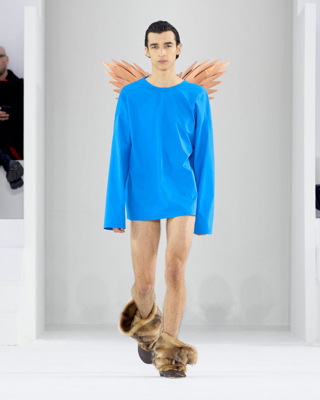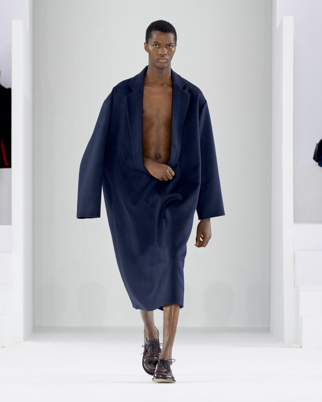 在États-Unis 廣場上座五層樓的超級現代建築,成為了 Maison Margiela 的新總部,也是2023秋冬男女裝系列的表演場地。觀眾從地下走到屋頂露台一個「無菌空間」,John Galliano 拆解了倫敦70年代和 80年代初的亞文化元素,再次搬上天橋。將格子恤衫短褲和流蘇毛毯(由 Pendleton 製作) 反轉再拼合,男生都穿上長襪和Tabi皮鞋,把美腿顯得更修長。由於大部分設計都把上衣款式的前幅和後幅反轉,衣服的背面往往比前面更多細節和趣味。加上Galliano 向來愛加人造型中的紙摺帽和面紗,令人眼花繚亂。比女模更姣的Leon Dame 踏上戲劇化的貓步壓軸,讓現場手機影個不停,在社交媒體上大洗版。