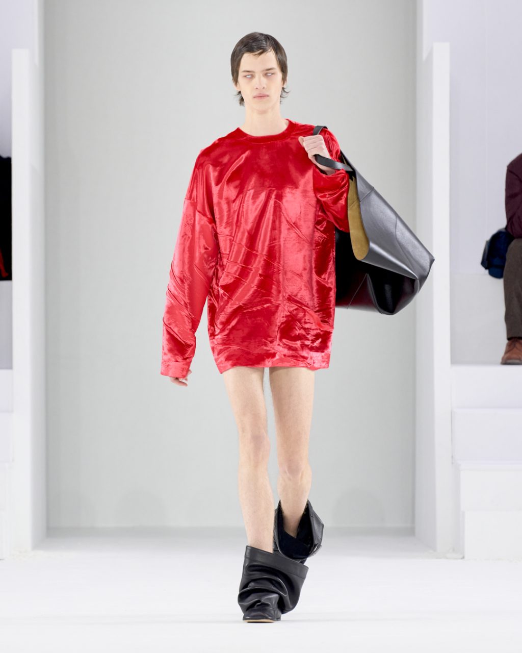 告別前任舵手後,Gucci首先回到了男裝時裝過,邀請噪音搖滾三人組 Marc Ribot’s Ceramic Dog 在天橋中央的轉盤舞台為時装展作現場表演。在他們融合爵士與punk 等元素的即興創作的音樂下,創作團隊帶來了一個款式和輪廓甚為簡約的系列,宣告品牌與此前的 Maximalism 華麗風格告別。以寬鬆剪裁為主調的服裝,混合 80年代的運動風和2000年代的電單車風格,帶點不羈和性感。此外重點還有可拆式元素,讓穿着者可以自由拆除西裝外套的衣袖,或將長褲變成短褲,使系列變得實用與型格兼具。同時,褪去繁複造型的新作也令觀眾更能注意到 Gucci 的配飾:Dionysus 雙虎頭袋釦的 messenger bag、掛上仿舊絲巾的 Bamboo 1947、各款用上亮色的Crystal GG 塗層帆布的手袋和皮鞋系列整體風格不算極強烈,因為今季是迎接新任舵手 Sabato De Sarno 前的一個轉折期,放輕鬆一點實在正確不過。