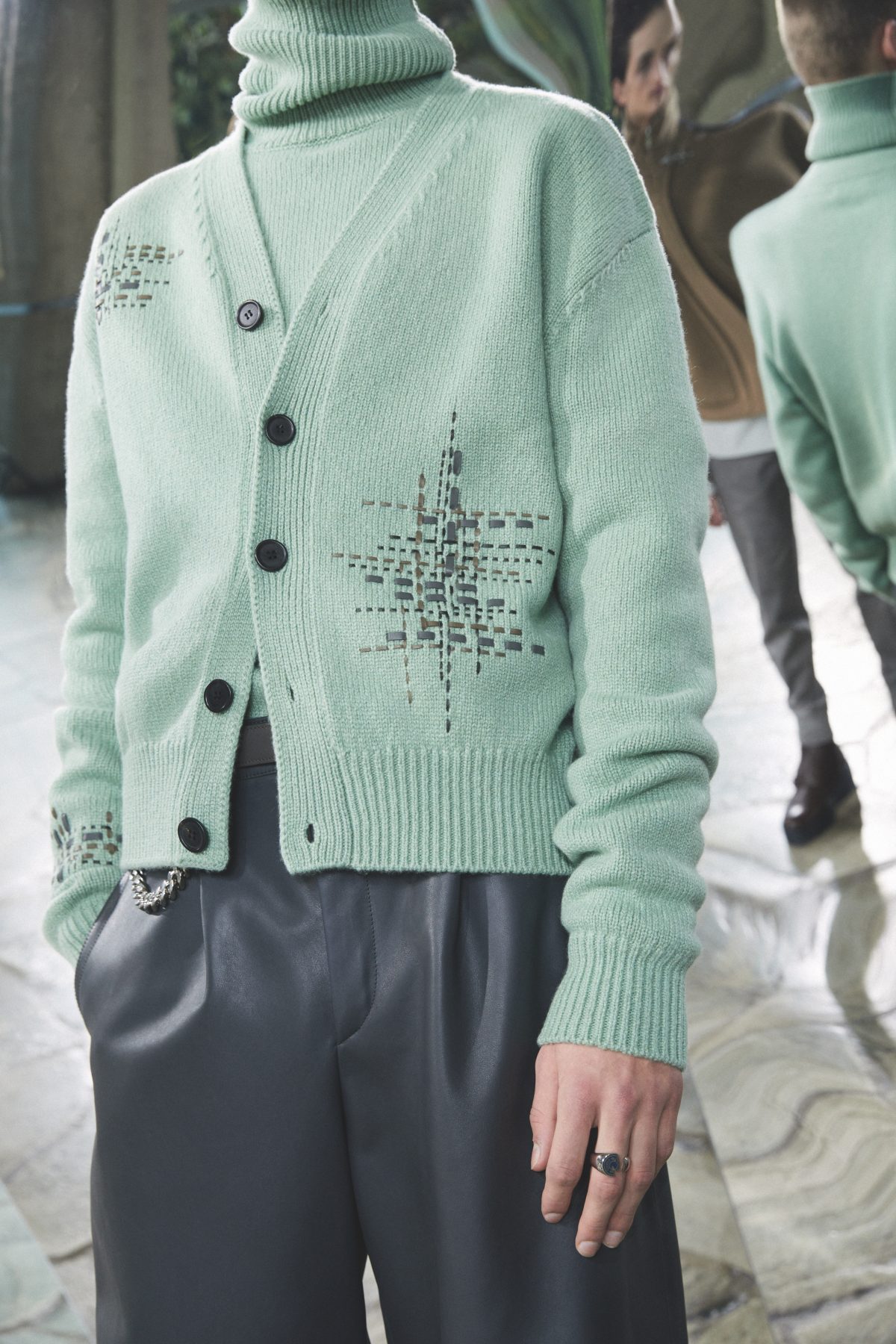 告別前任舵手後,Gucci首先回到了男裝時裝過,邀請噪音搖滾三人組 Marc Ribot’s Ceramic Dog 在天橋中央的轉盤舞台為時装展作現場表演。在他們融合爵士與punk 等元素的即興創作的音樂下,創作團隊帶來了一個款式和輪廓甚為簡約的系列,宣告品牌與此前的 Maximalism 華麗風格告別。以寬鬆剪裁為主調的服裝,混合 80年代的運動風和2000年代的電單車風格,帶點不羈和性感。此外重點還有可拆式元素,讓穿着者可以自由拆除西裝外套的衣袖,或將長褲變成短褲,使系列變得實用與型格兼具。同時,褪去繁複造型的新作也令觀眾更能注意到 Gucci 的配飾:Dionysus 雙虎頭袋釦的 messenger bag、掛上仿舊絲巾的 Bamboo 1947、各款用上亮色的Crystal GG 塗層帆布的手袋和皮鞋系列整體風格不算極強烈,因為今季是迎接新任舵手 Sabato De Sarno 前的一個轉折期,放輕鬆一點實在正確不過。