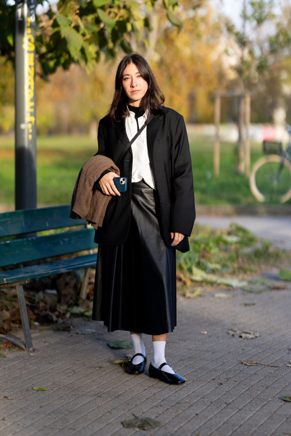秋冬穿搭公式#7:西裝外套 + 皮革長裙