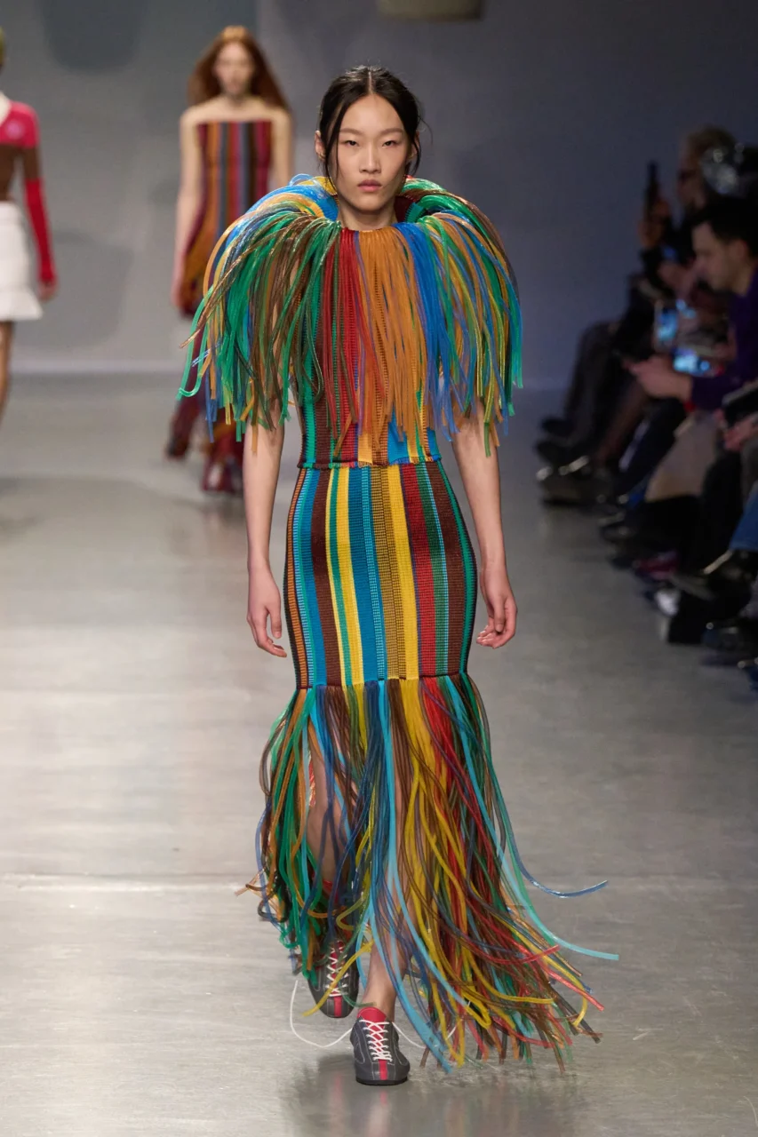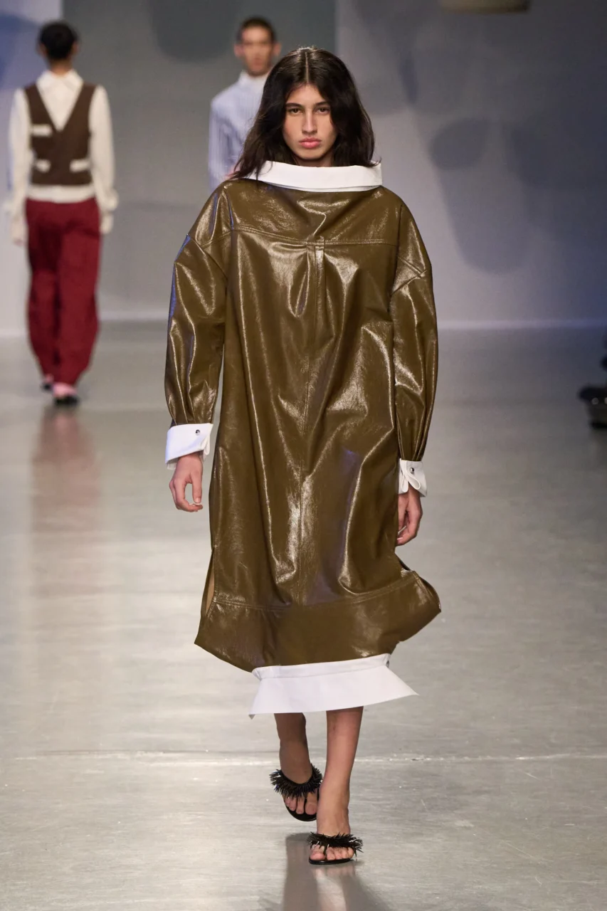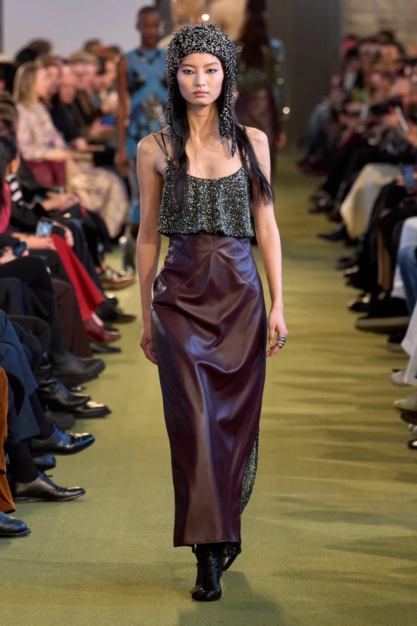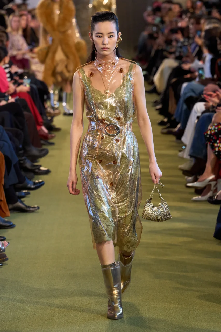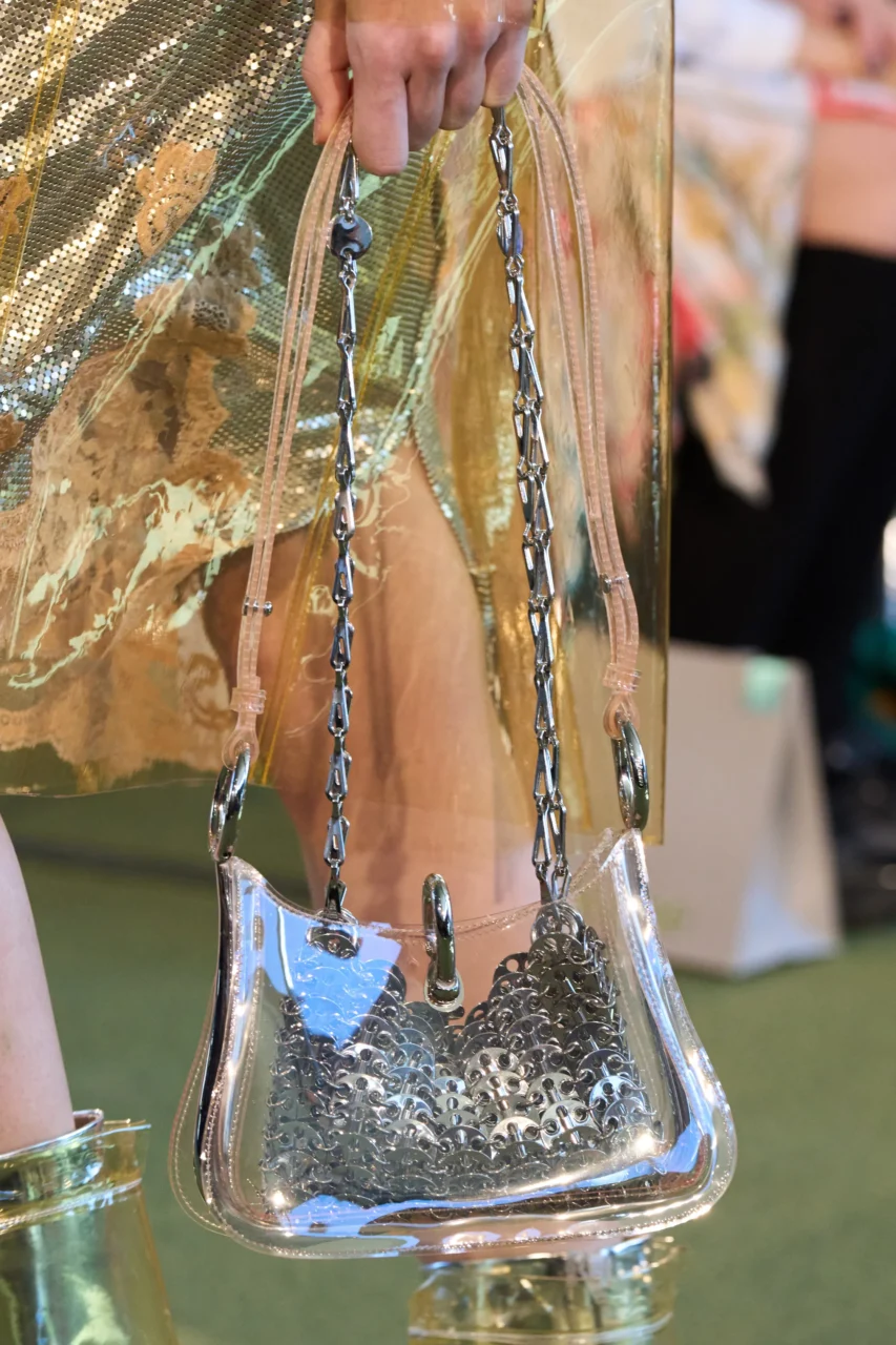 Rabanne 2025秋冬系列透過不同材料和紋理帶來鮮明對比,創意總監Julien Dossena希望以一種「爆發性」的視覺效果顛覆奢侈穿搭風格,例如外套常用的人造毛皮變成連身裙、透明質料有如雨衣一樣包裹著華服。手袋方面也看到這個效果,例如用珠飾取代皮革、以透明袋包裹著珠片手袋等。