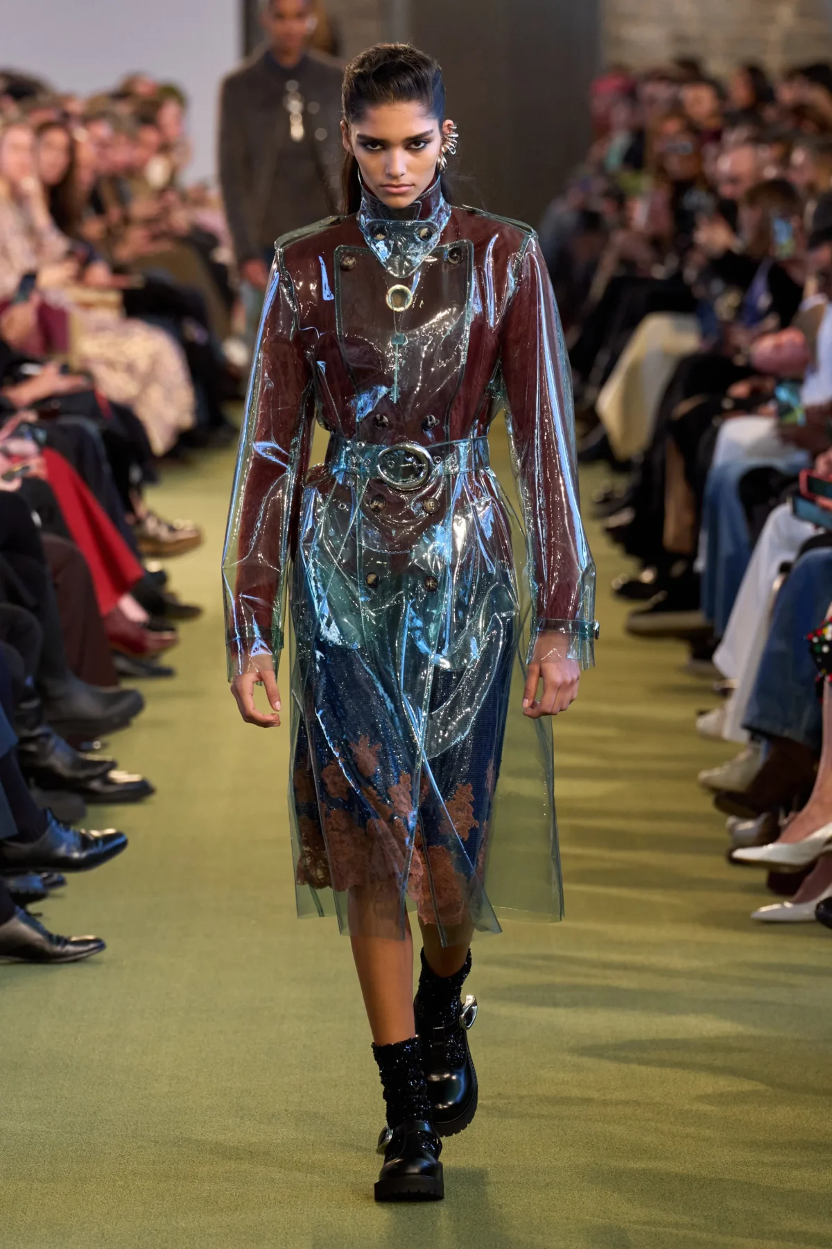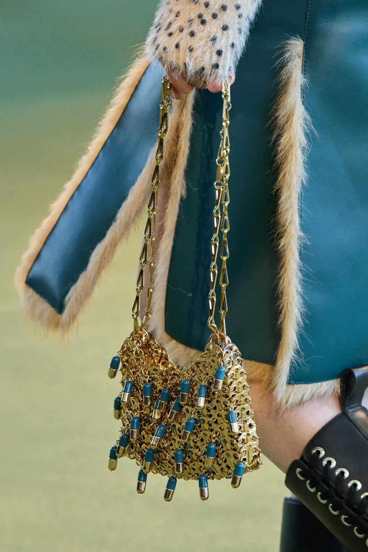 Rabanne 2025秋冬系列透過不同材料和紋理帶來鮮明對比,創意總監Julien Dossena希望以一種「爆發性」的視覺效果顛覆奢侈穿搭風格,例如外套常用的人造毛皮變成連身裙、透明質料有如雨衣一樣包裹著華服。手袋方面也看到這個效果,例如用珠飾取代皮革、以透明袋包裹著珠片手袋等。