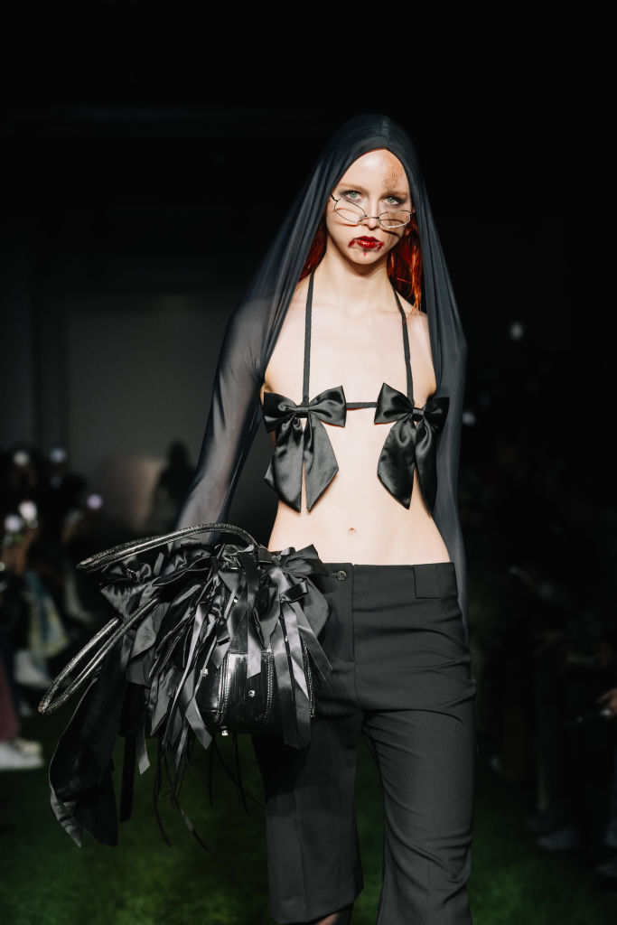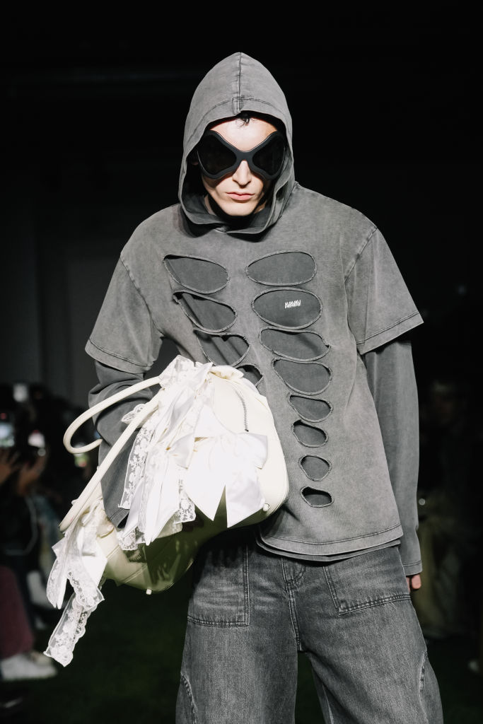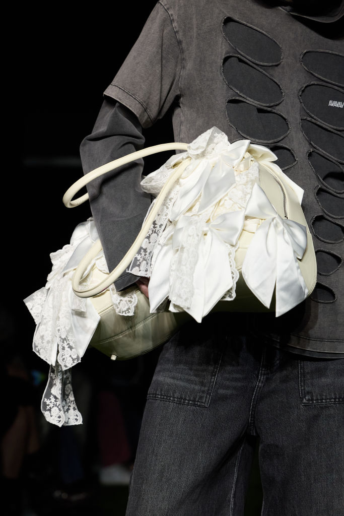 AVAVAV屢次因話題性十足的發佈形式引起關注,今季品牌延續上一季在跑步賽道的場地設定,模特兒們化身為橄欖球賽的人物,卻化上受傷的妝容,以一種暗黑、解構主義風格展現主題。近幾季流行的蝴蝶結元素在AVAVAV的演繹下變得反骨,以狂放的姿態鋪墊在手袋上。