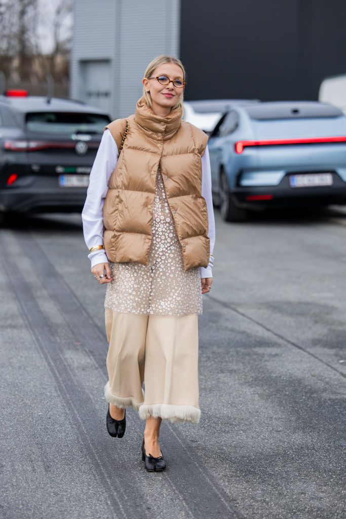 COPENHAGEN, DENMARK - JANUARY 30: Hollie Mercedes Peters wears Chanel bag, brown puffer vest, beige wide leg pants outside Marimekko during the Copenhagen Fashion Week Autumn/Winter 2025 on January 30, 2025 in Copenhagen, Denmark. (Photo by Christian Vierig/Getty Images)
