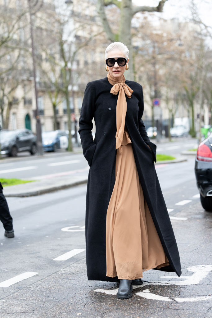PARIS, FRANCE - JANUARY 30: A guest wears black leather shoes, black sunglasses, gold pendant earrings, a black long coat and a blush pink long shirt dress outside Juana Martin show during The Haute Couture Spring-Summer 2025 as part of Paris Fashion Week on January 30, 2025 in Paris, France. (Photo by Valentina Frugiuele/Getty Images)