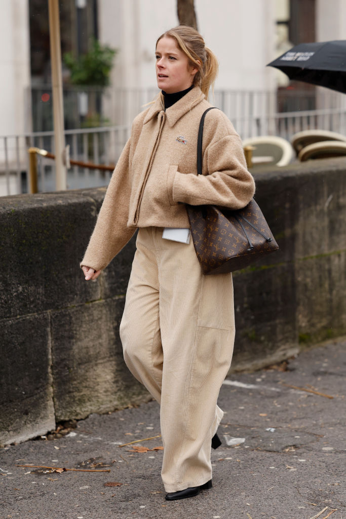 PARIS, FRANCE - JANUARY 29: A guest wears beige Lacoste jacket, beige pants, brown Louis Vuitton bag, outside Elie Saab, during the Haute Couture Spring-Summer 2025 as part of Paris Fashion Week on January 29, 2025 in Paris, France. (Photo by Claudio Lavenia/Getty Images)