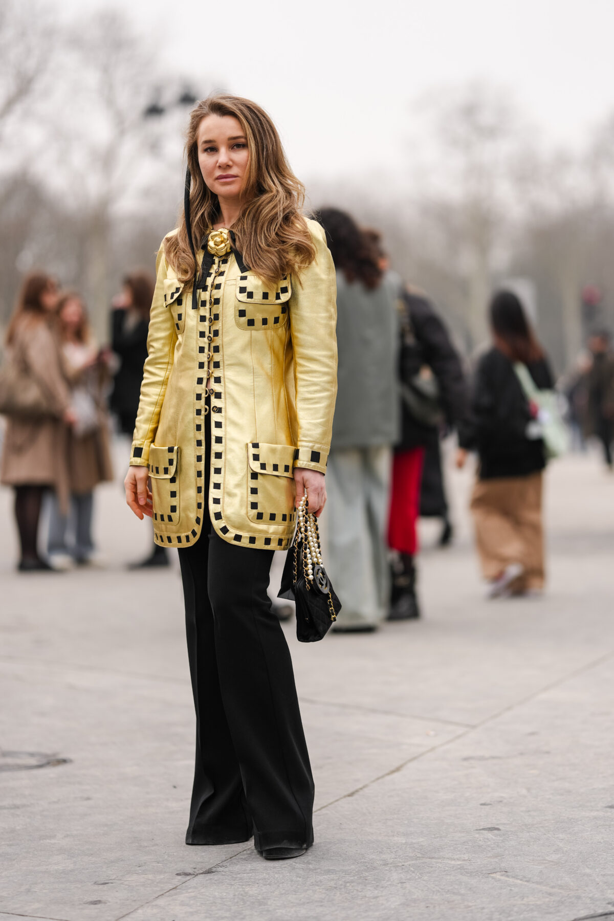 PARIS, FRANCE - MARCH 11: A guest wears gold metallic Chanel blazer leather jacket, black trouser pants, black pearl Chanel leather bags, outside Chanel, during the Paris Fashion week Women's Fall/Winter 2025-2026 on March 11, 2025 in Paris, France. (Photo by Edward Berthelot/Getty Images)