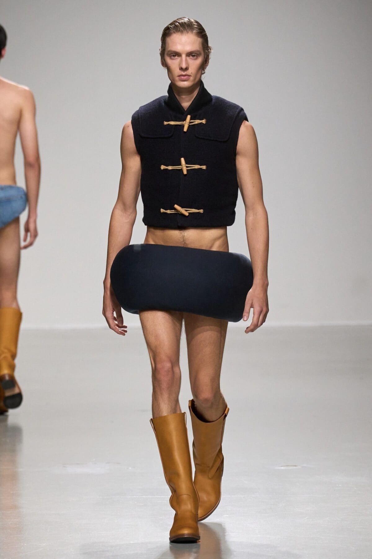 沒錯,Duran Lantink 就是那位以乳膠「裸體上衣」、大膽的「後空」牛仔褲(NSFW ass-less jeans)成為 FW 25 時裝周最具話題的設計師——在網上引起 viral 式轉發成為了今季一大時尚熱話,但這位設計師的才華卻遠不止於此。
