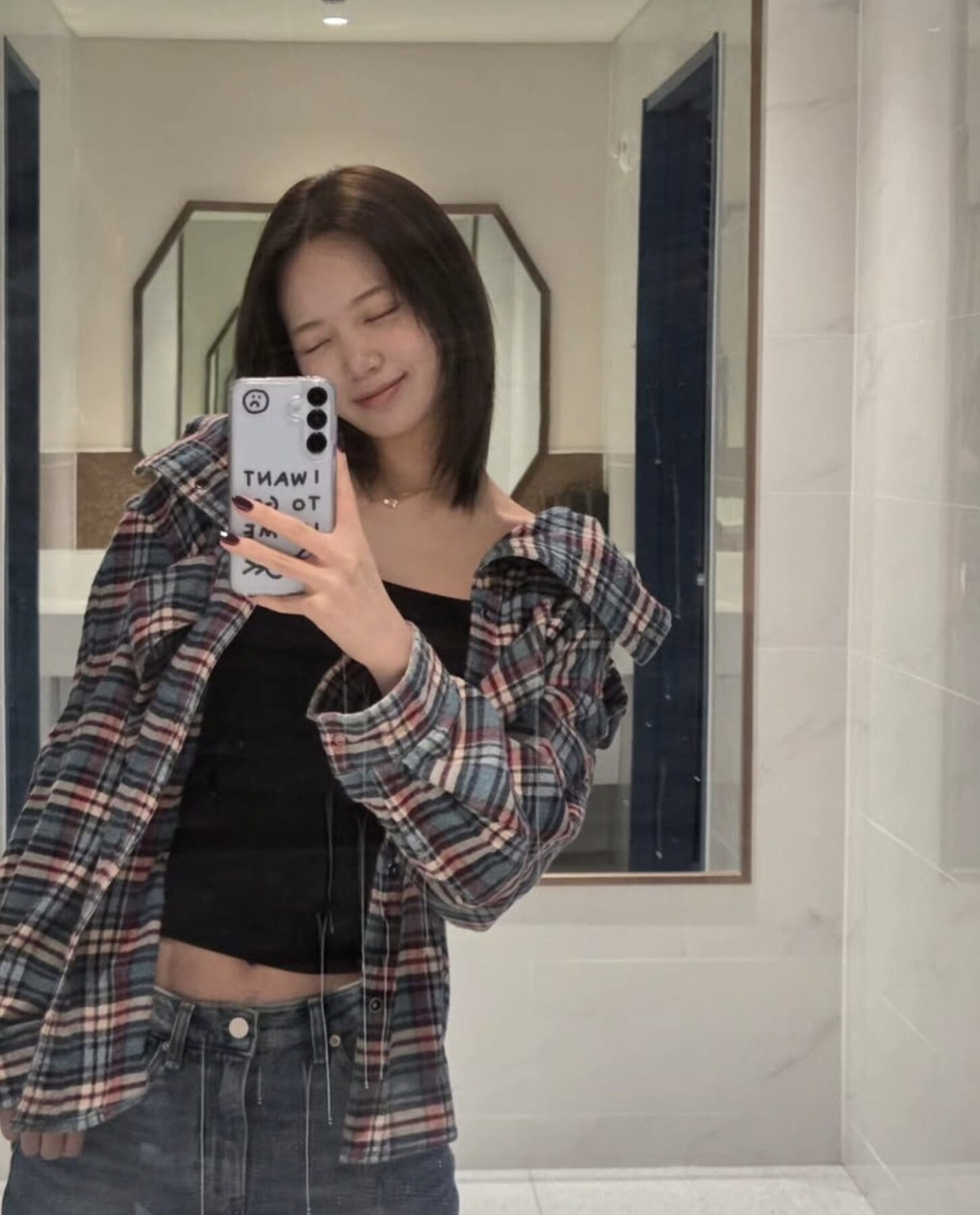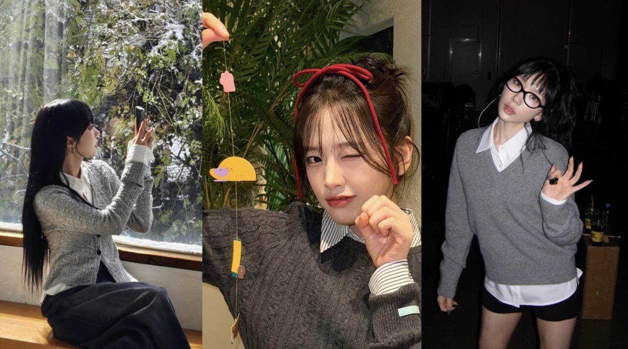 若你是「怕冷人士」,可以將簡約的恤衫作為內搭,外面疊穿一件灰色毛衣,打造層次豐富且兼具溫暖感的造型。灰色毛衣的中性色調與恤衫形成柔和對比,營造出學院風或知性風格。想更有造型感,可以參考SinB、俞真和太妍,把襯衫的衣擺和袖口自然露出,增添隨性感;下身可搭配黑色牛仔褲、寬褲或裙裝,整體造型既舒適又有型。