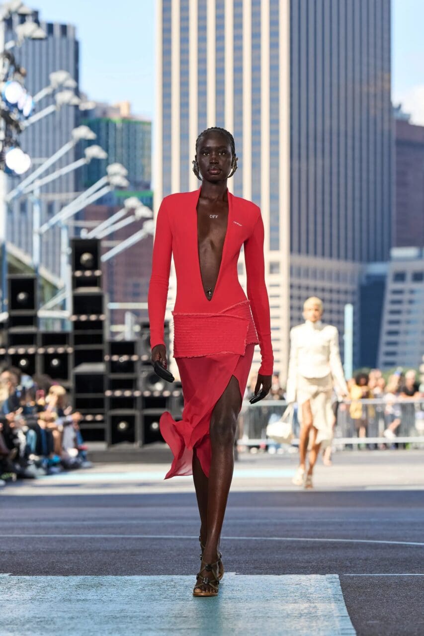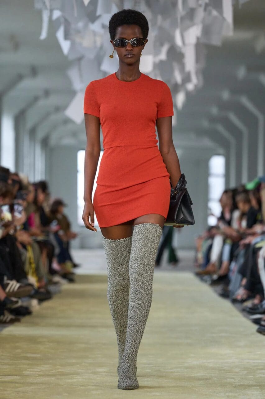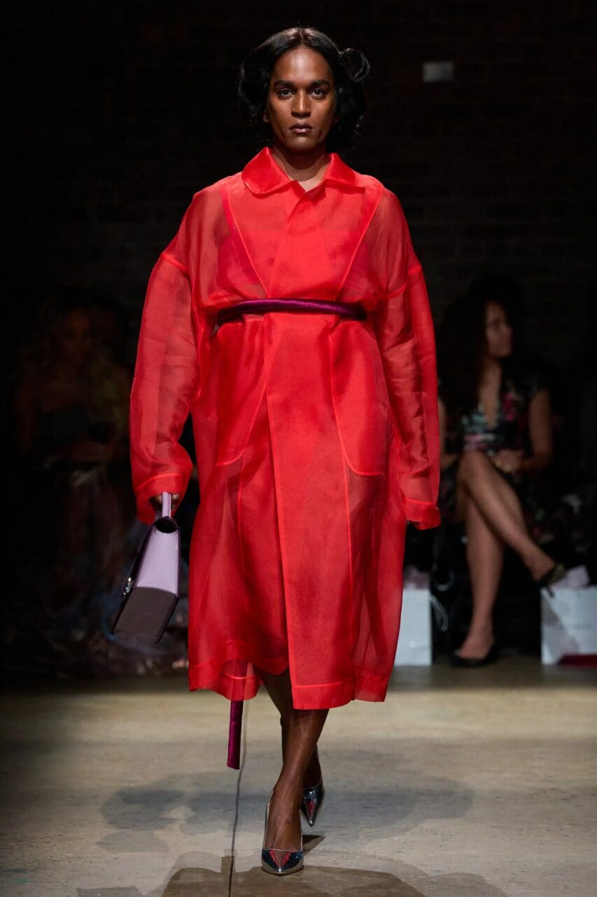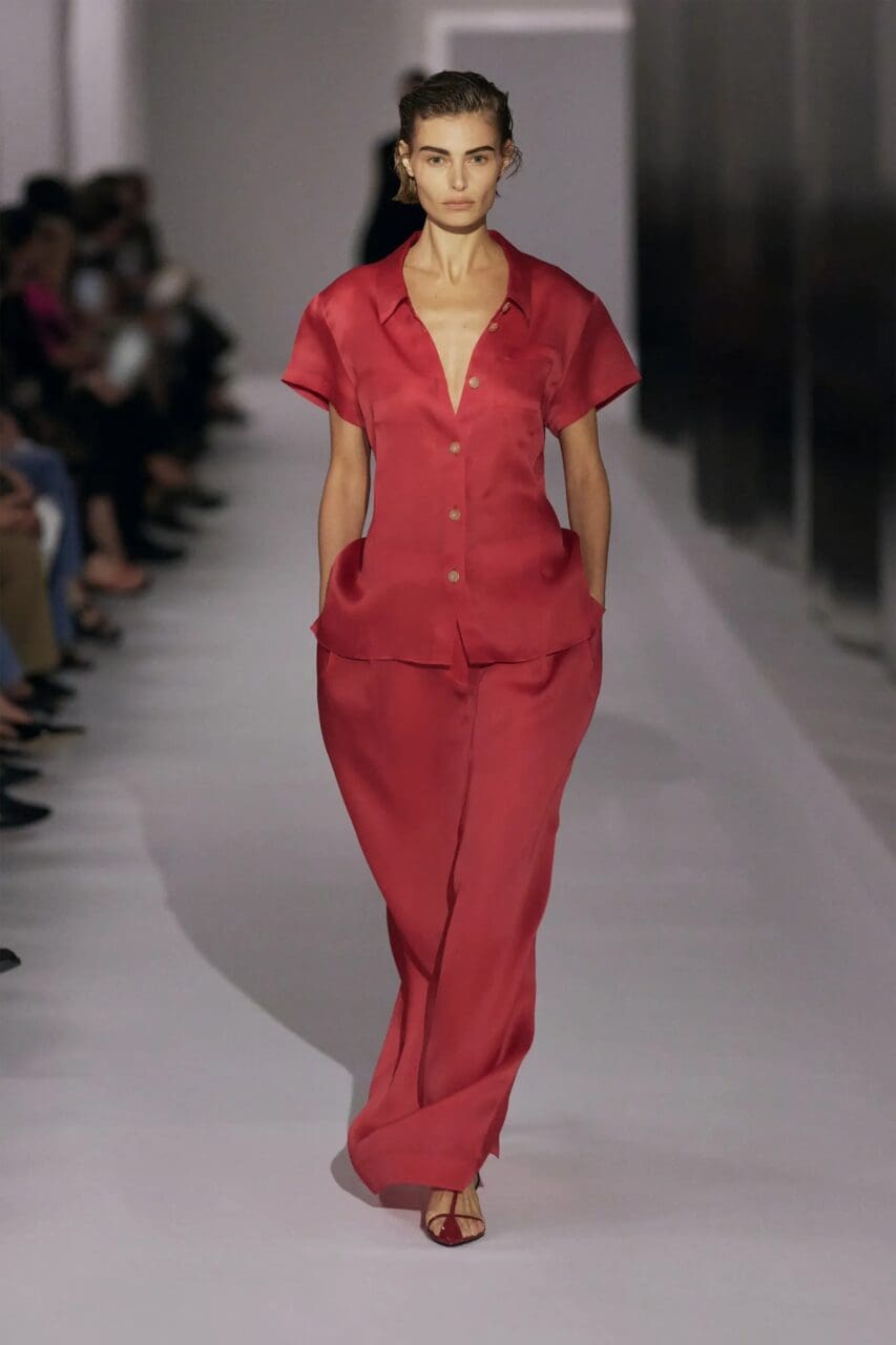 紅色將繼續是明年衣櫥中最引人注目的顏色之一。雖然在時裝展上我們發現了不同的版本,但主流的卻是一種鮮豔的色調,像 Bach Mai 這樣輕質材料的風衣,或是如 Khaite 打造的緞面套裝。全身紅色的搭配想法非常吸引人,能夠打造出極其精緻的造型,而 Tibi 也明確表達了這一點。