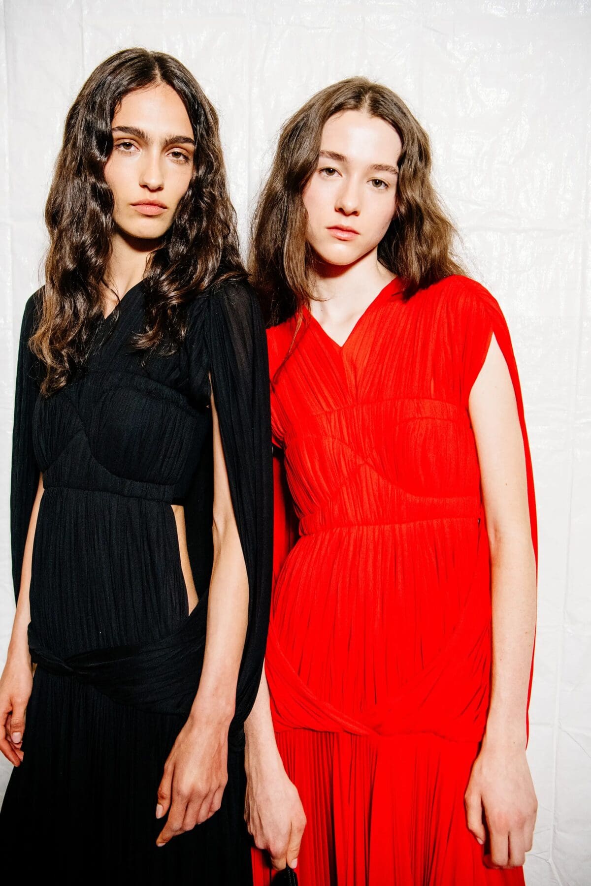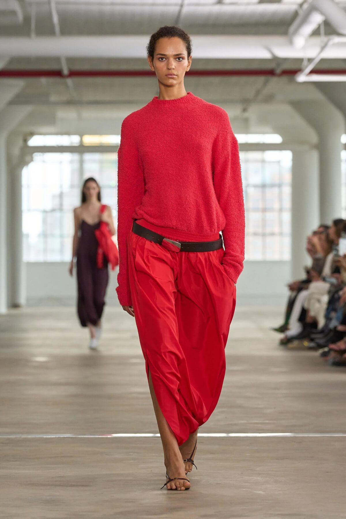紅色將繼續是明年衣櫥中最引人注目的顏色之一。雖然在時裝展上我們發現了不同的版本,但主流的卻是一種鮮豔的色調,像 Bach Mai 這樣輕質材料的風衣,或是如 Khaite 打造的緞面套裝。全身紅色的搭配想法非常吸引人,能夠打造出極其精緻的造型,而 Tibi 也明確表達了這一點。