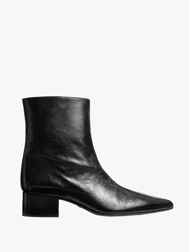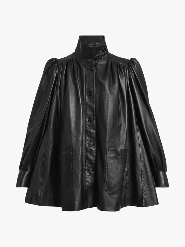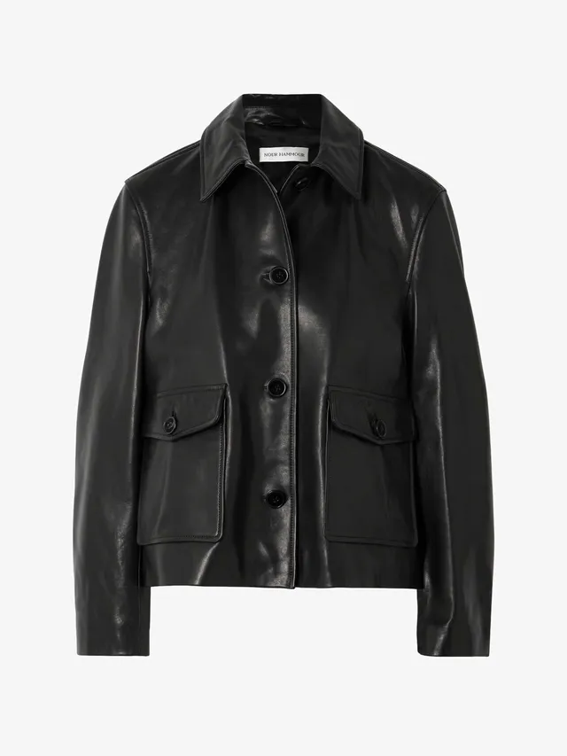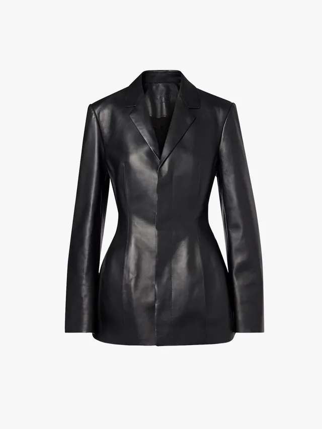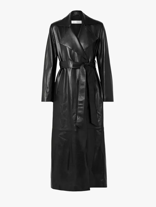 皮革外套的搭配潛力非常靈活,晚上赴約時,可將 The Park 連身 Catsuit 與 Amina Muaddi 尖頭鞋搭配 Alexis Bittar 皺摺金耳環。外搭的 Khaite 皮革風衣,則能立即化身俐落的約會戰袍。