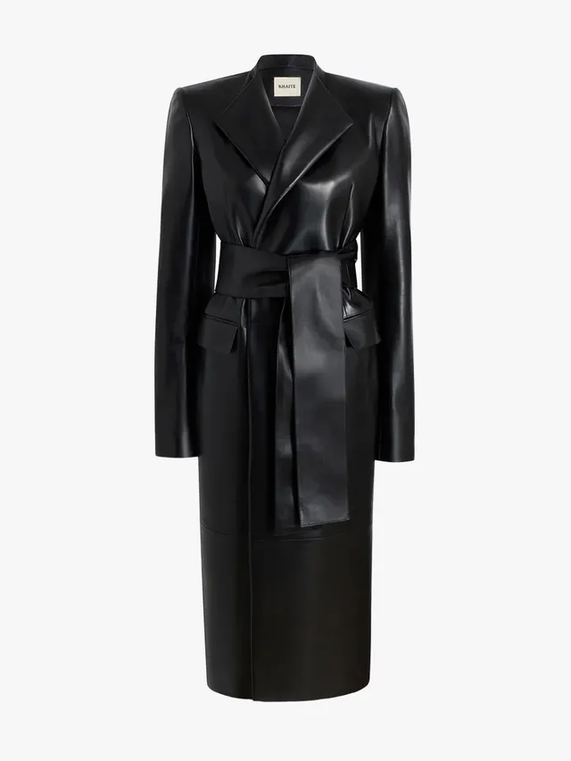 皮革風衣(Trench Coat)能將外套變成整體造型的主角,可以將 Khaite 的 Jelson 風衣披掛於 The Park 連身褲裝,最後搭配 Alexis Bittar 皺褶金耳環與 Amina Muaddi 尖頭鞋,讓整體造型更加和諧。