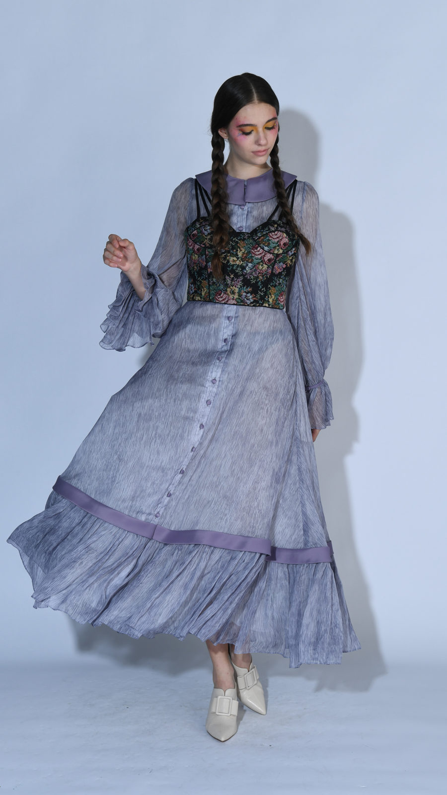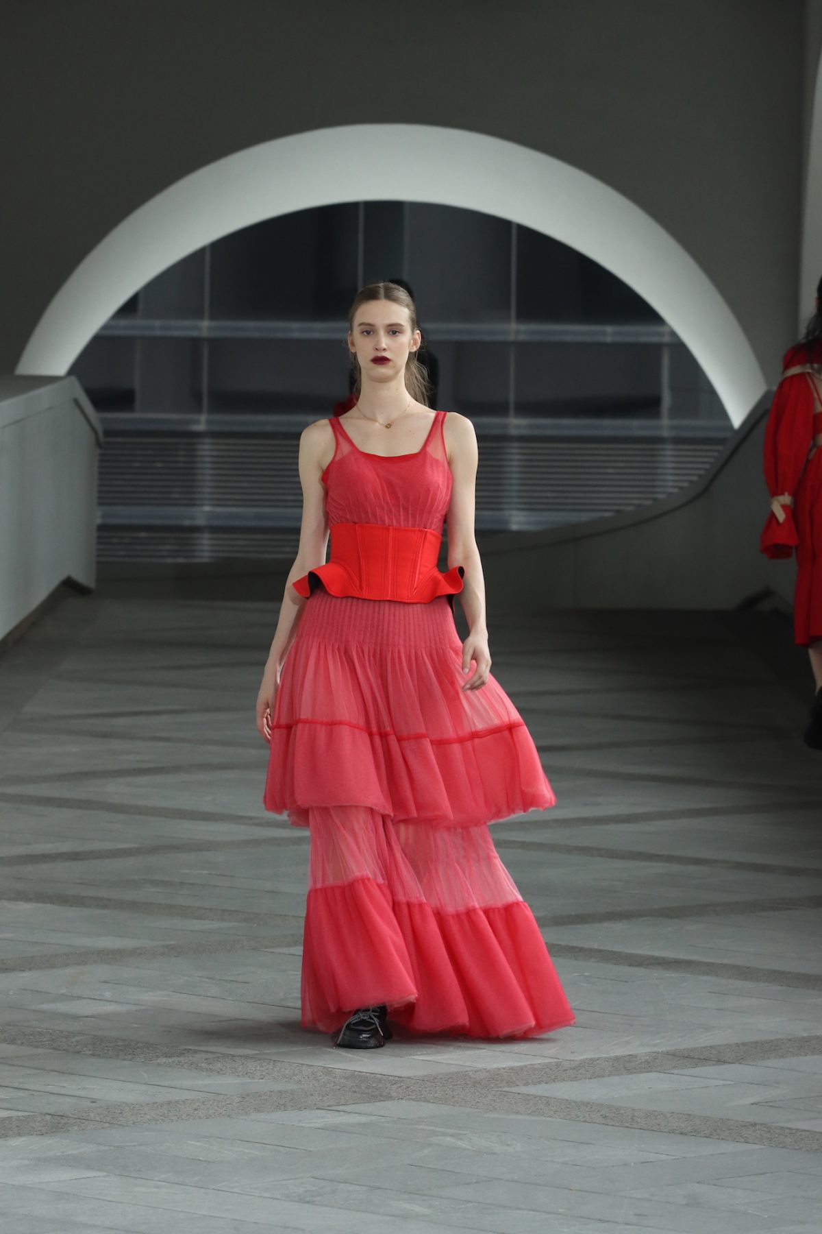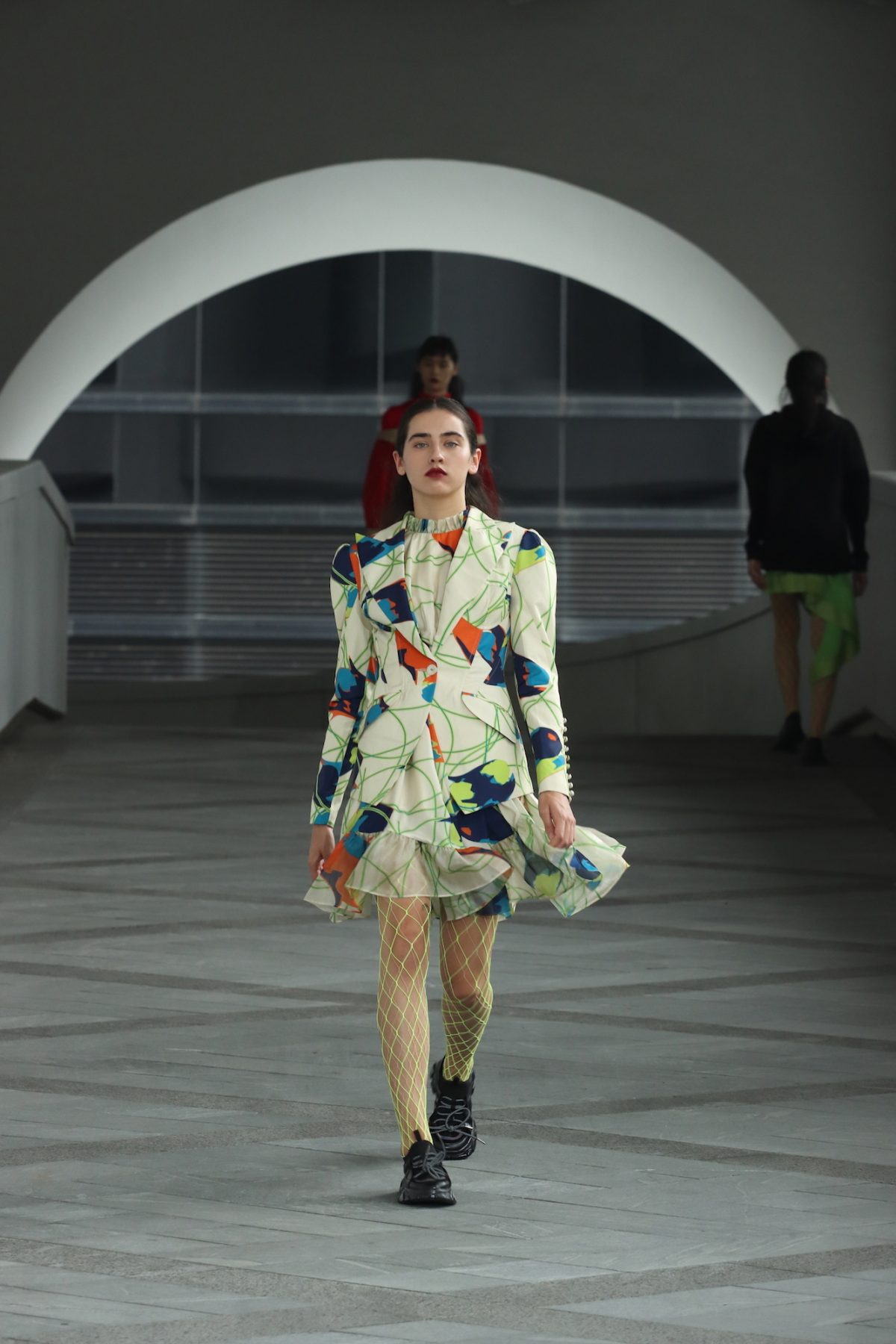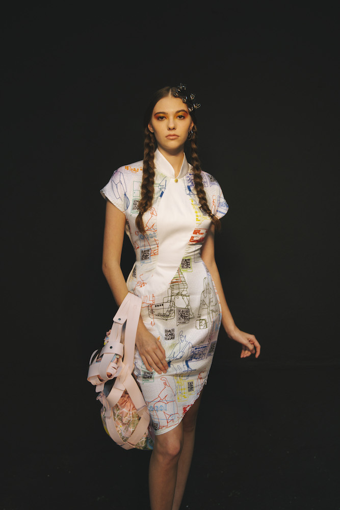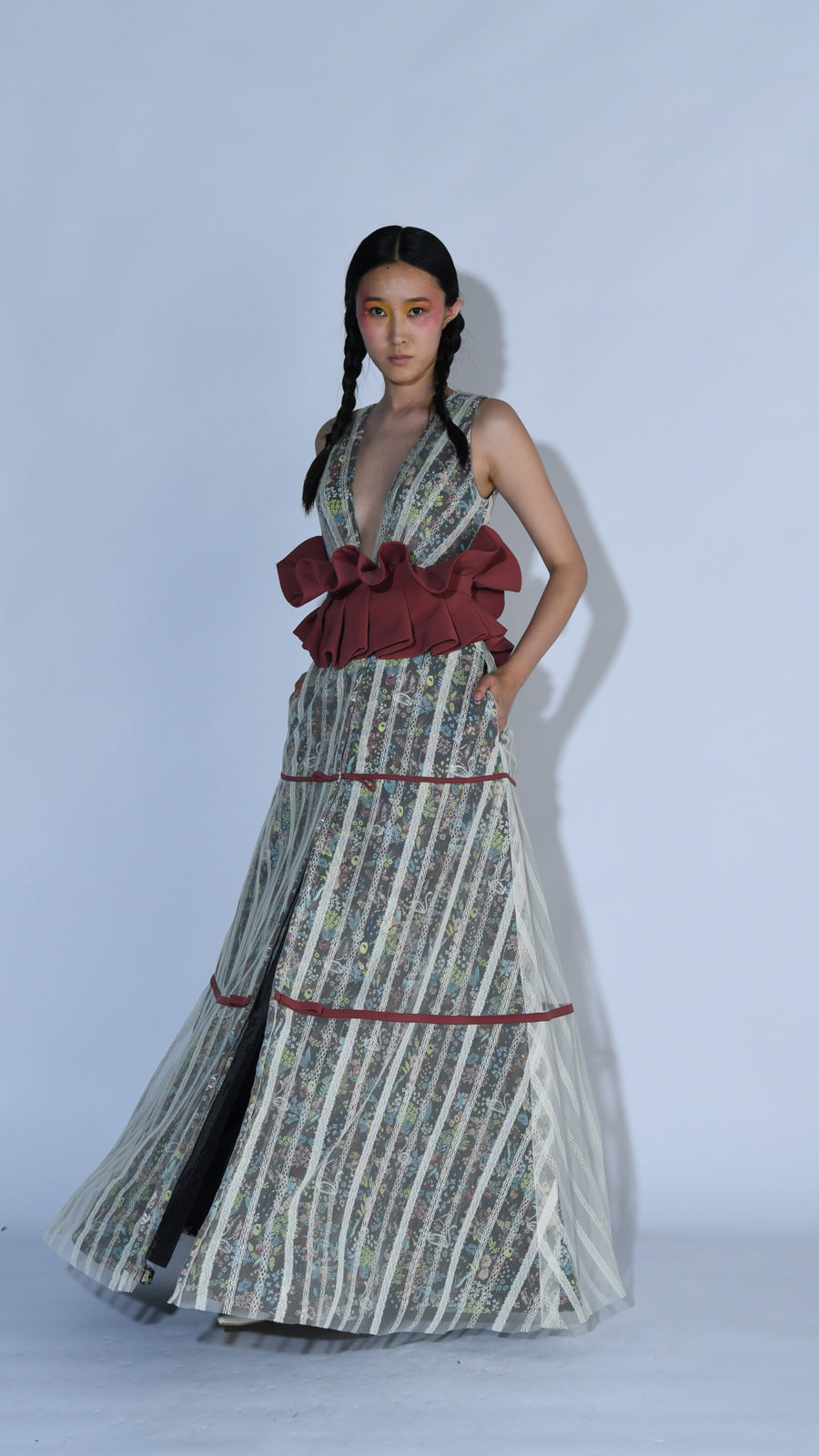 Doris Kath Chan 透過花粉傳播比喻延續生命,花朵圖案以及輪廓呈鐘擺型的裙擺,充滿活力。