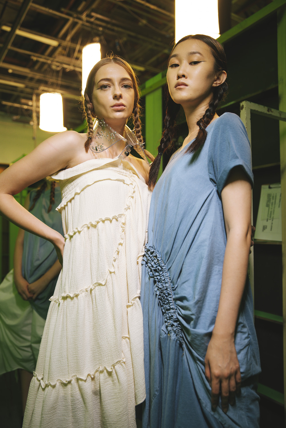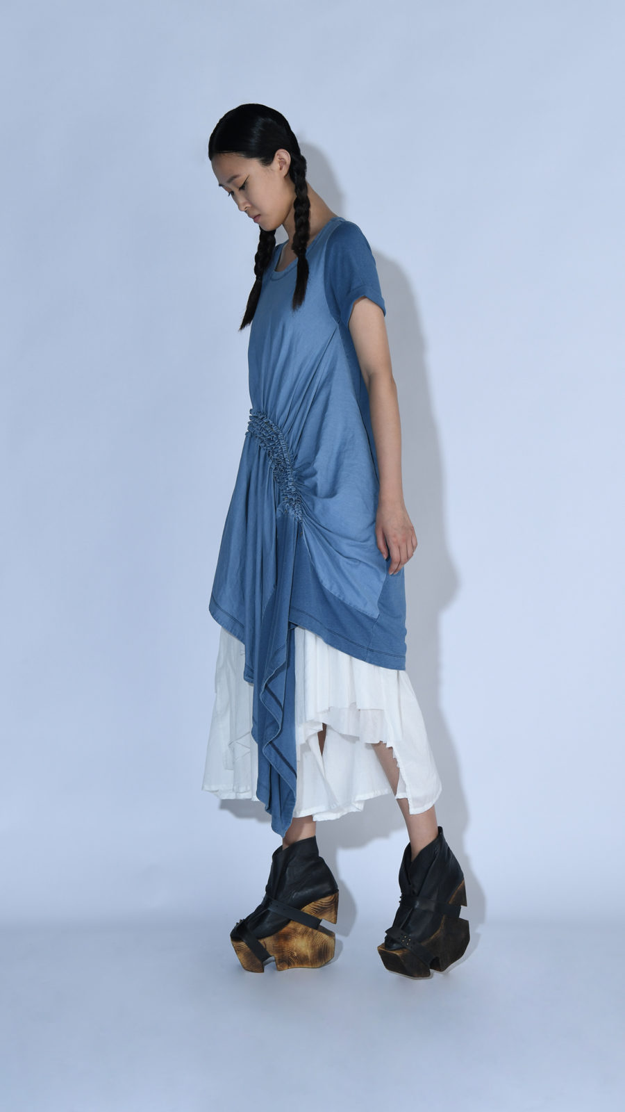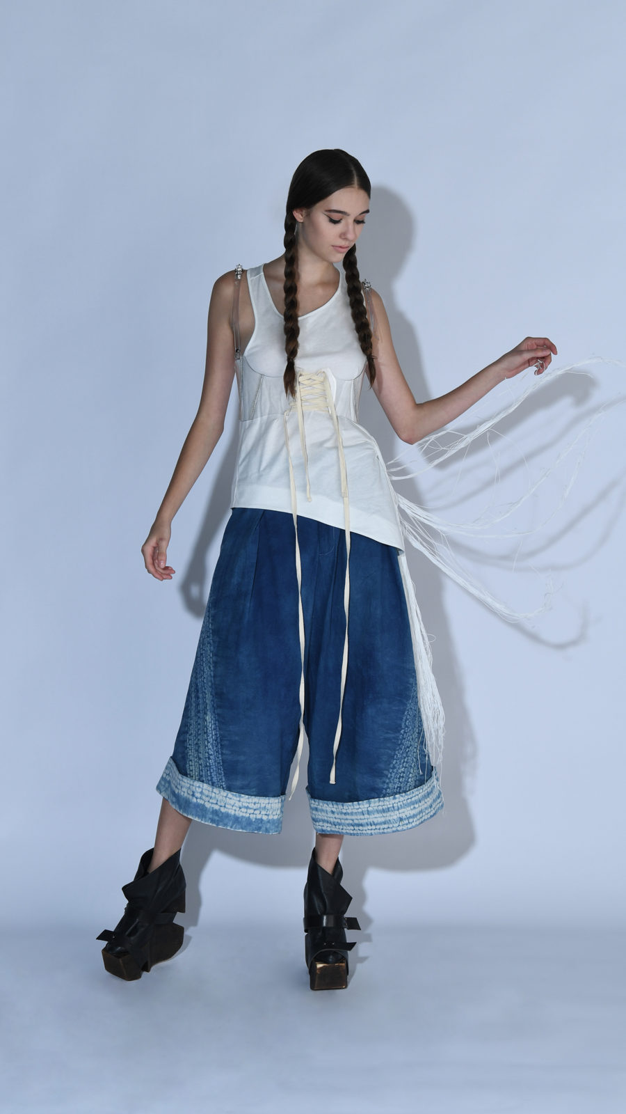 以 Blue Virus 為題,設計師 Yeung Chin 楊展受靛藍染料及藍曬工藝的啟發,加上品牌標誌性的不對稱剪裁和對傳統細節的拆解,運用設計帶來淡淡的憂鬱。