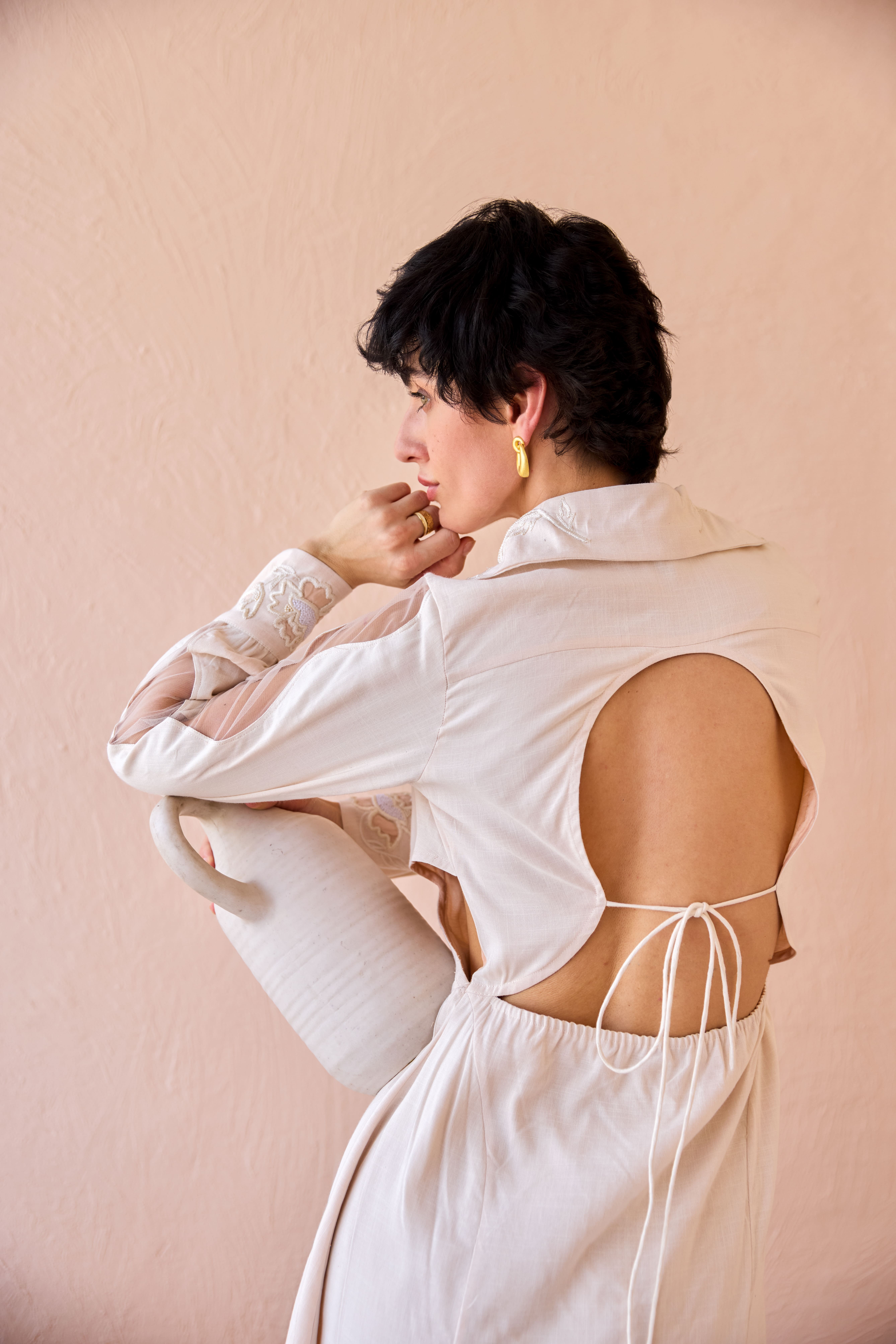 AARUSHI:「Between The Lines」是一個人手染色的日本絞染(Arashi Shibori)系列,它一直是我的最愛之一。這是我們首次嘗試傳統絞染,這種手染方法要先將布料緊緊包裹在圓柱上,每一個勒出的摺痕和圖案都是驚喜。這不僅僅是一件衣服,它更像是一種藝術的即時展現。這個系列承載著一種自然和靈性的狀態,由這種技術製作的每件作品都是獨一無二的;而最具情感的創作,則是我為父母設計的作品——為母親製作的手工棉絲混紡連衣裙,以及為父親設計的純亞麻襯衫,兩件都有精緻的 Kantha 刺繡,繪出波浪狀的海洋圖紋。為我生命中最重要的兩個人設計作品,對我而言別具意義。