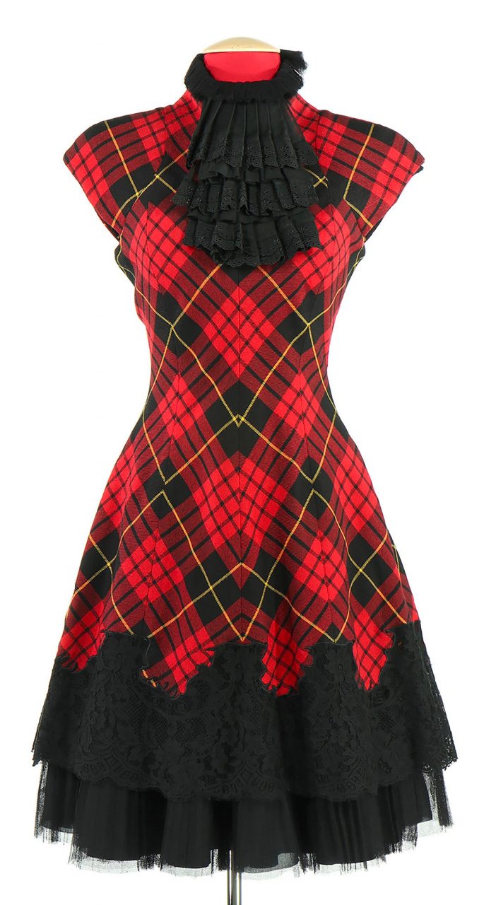 McQueen Tartan Wool Dress, 'The Widows of Culloden', Autumn-Winter, 2006. Red, black and gold overcheck cap sleeve dress with black lace jabot & petticoat, with nude knit busier and formative pad. Sample size.Photo: Courtesy of Doyle