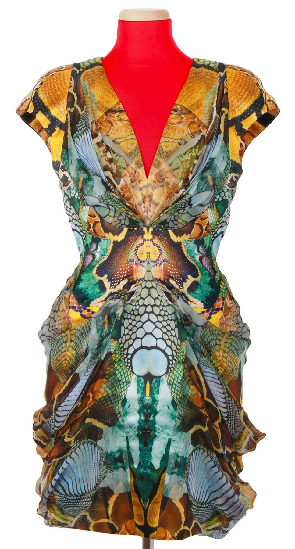 Reptile Print Silk Dress, 'Plato's Atlantis', Spring-Summer 2010 Multi-color silk reptile kaleidoscope print dress with plunging v-neck and cap sleeves. Sample size. $6,000-8,000Photo: Courtesy of Doyle