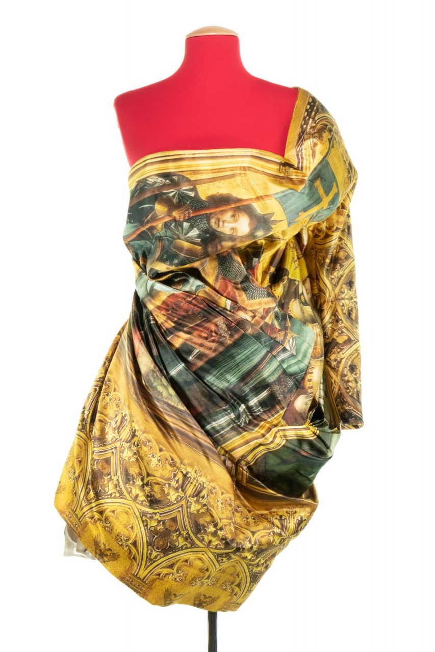 Multi-Color Silk Satin Medieval Print Ensemble, 'Angels and Demons', Fall-Winter, 2010. Gold-tone and multi-color medieval print, with one shoulder and gold feather decorate. Sample size. $2,000-4,000Photo: Courtesy of Doyle