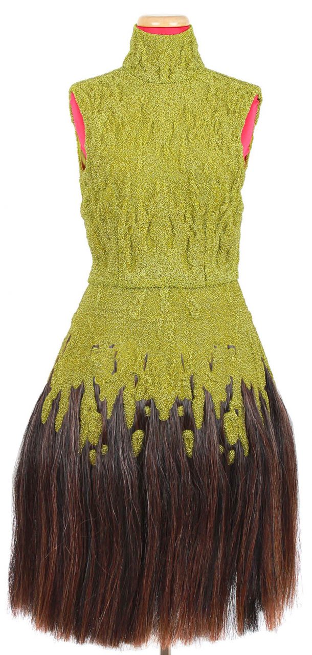Chartreuse Glass Bead and Synthetic Horsehair Midi-Dress, 'Eshu', Autumn- Winter 2000. Sleeveless with embellished bodice and stand-up collar. Sample size.Photo: Courtesy of Doyle