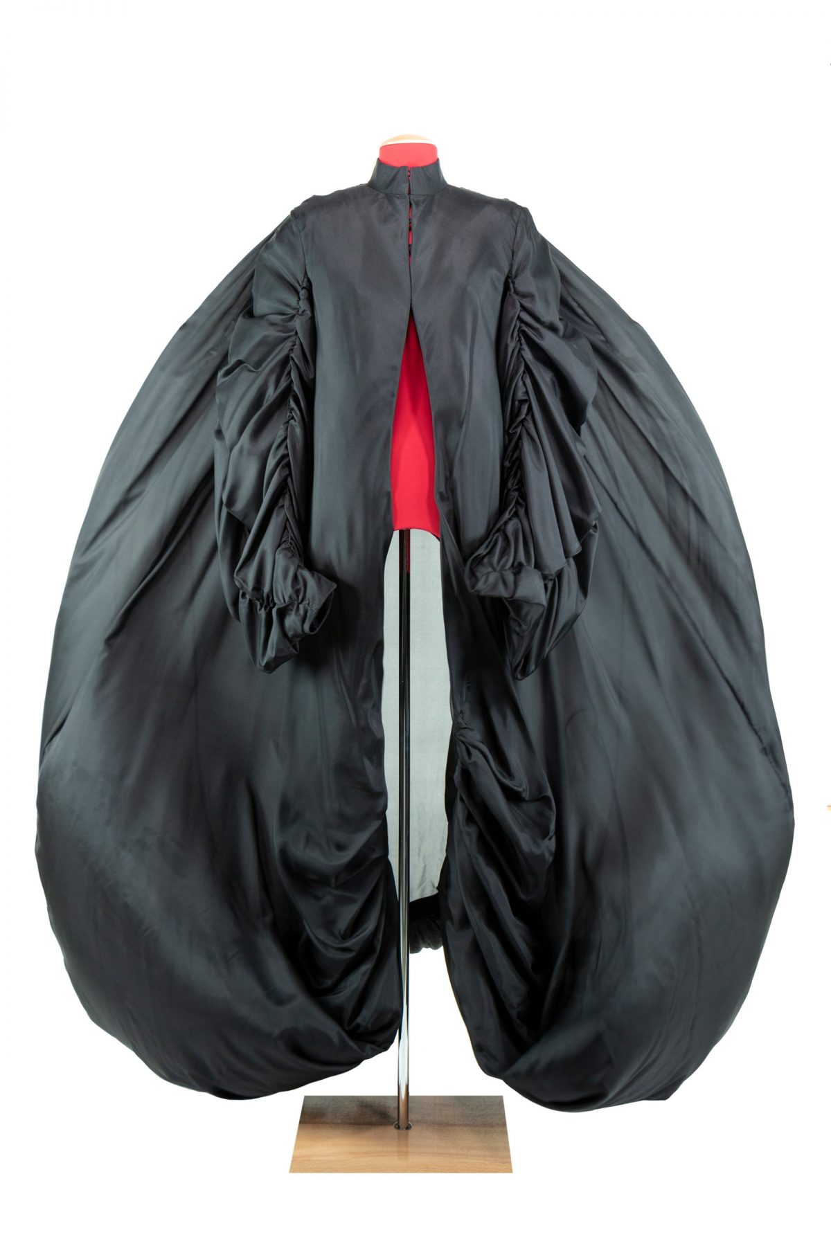 Black Silk Parachute Cape, 'Supercalifragilisticexpialidocious', Autumn- Winter 2002. Mandarin collar with eye-hook closure and exaggerated bishop sleeves, bubble back and train. One size.Photo: Courtesy of Doyle