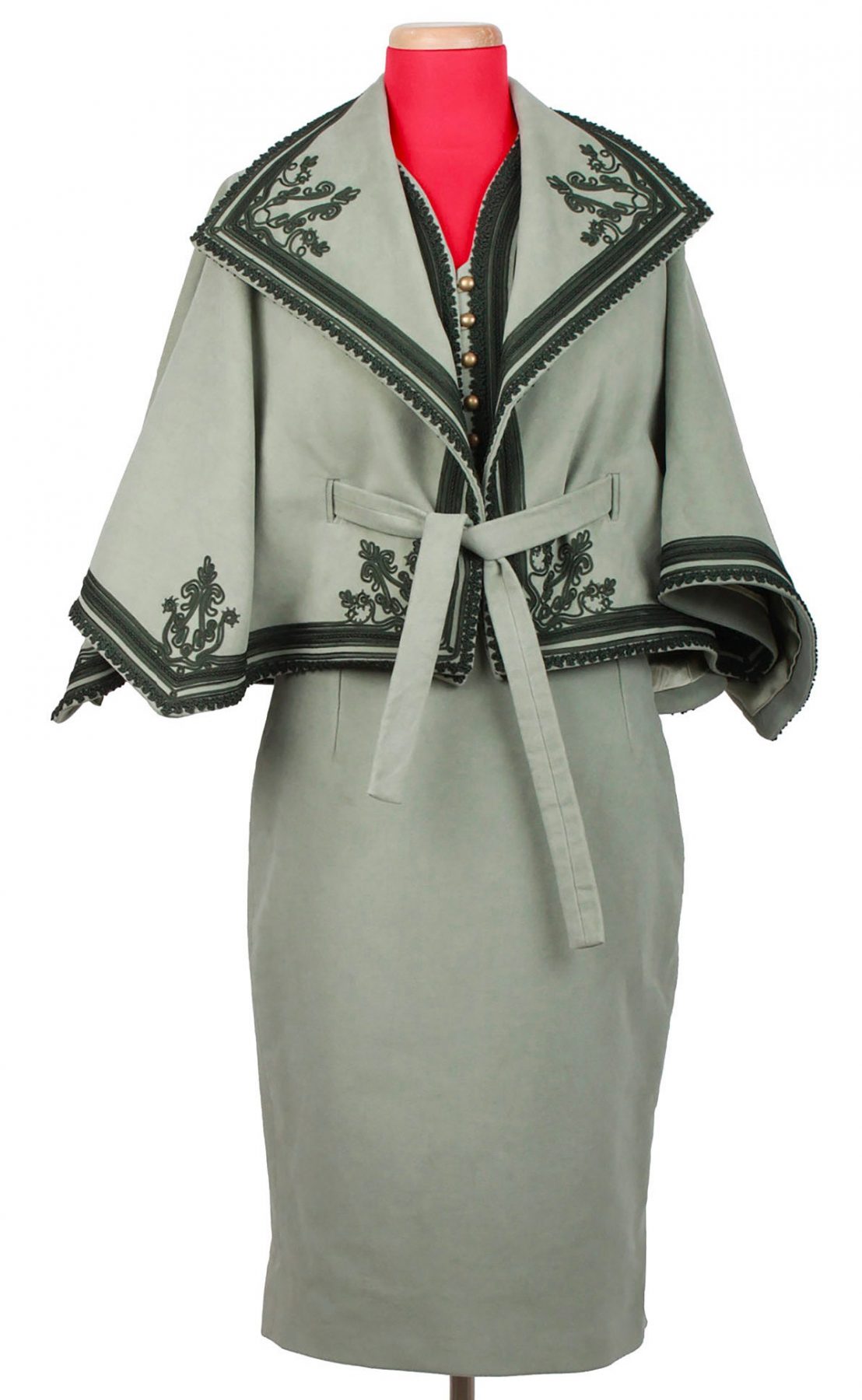 Velvet Vest Suit Ensemble, 'The Man Who Knew Too Much', Autumn-Winter 2005 Sage velvet v-neck vest suit with hunter green cord trim design and wide collar front tie cape. Sample size. $1,500-2,000Photo: Courtesy of Doyle
