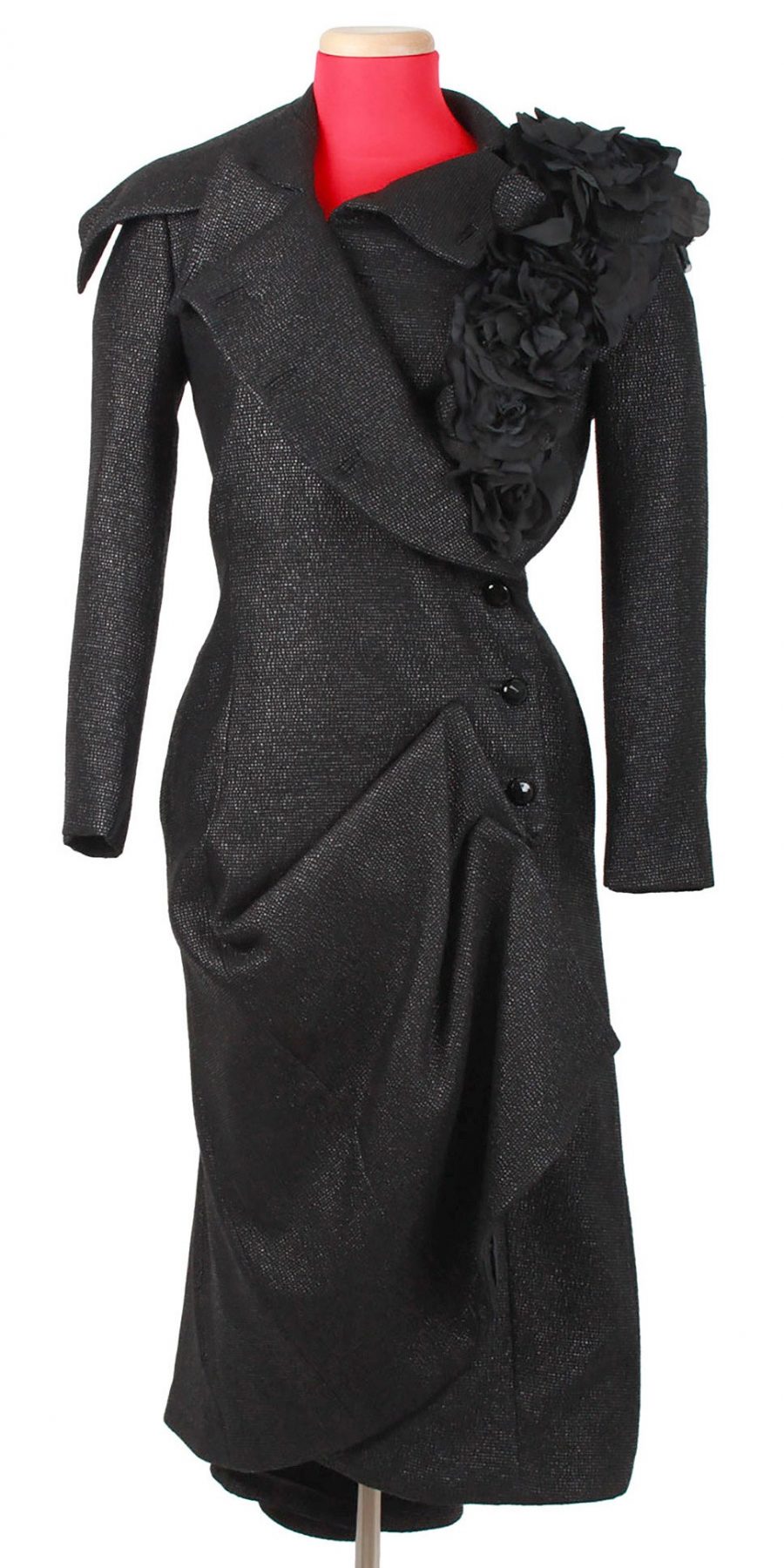 Black Wool and Bronze Metallic Woven Overcoat, 'Sarabande,' Spring-Summer, 2007 With side closure and hiked front hem with silk flower embellishment. Sample size; Together with Black Crepe Tricorn Shaped Fascinator. $7,000-10,000Photo: Courtesy of Doyle