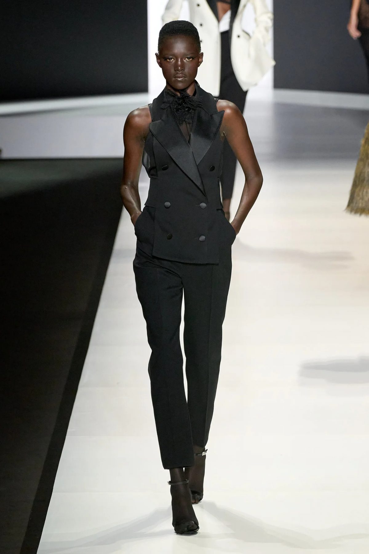 怎樣才能將這色調變成自己的風格? 不妨參考以下一些來自時裝騷的演繹。 Anthony Vaccarello的Saint Laurent靈感來自撒哈拉人的連身褲、Courrèges的超大恤衫和搖滾長褲、Chanel的皮革套裝、Dolce & Gabbana的剪裁西裝……不同品牌在2024年春夏時裝騷給大家帶來很多靈感。