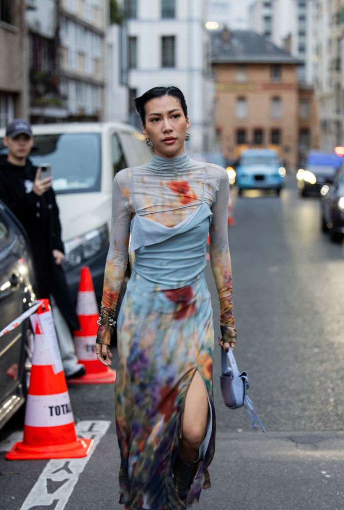 PARIS, FRANCE - FEBRUARY 28: Molly Chiang wears dress with graphic print, blue bag outside Acne during the Womenswear Fall/Winter 2024/2025 as part of Paris Fashion Week on February 28, 2024 in Paris, France. (Photo by Christian Vierig/Getty Images)