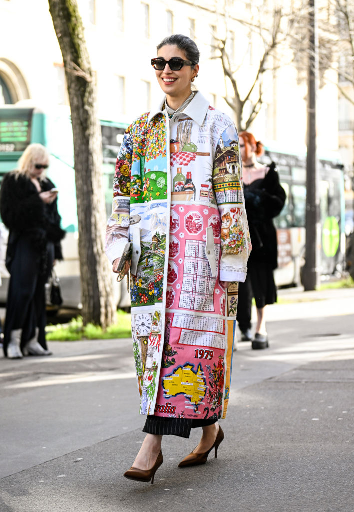 PARIS, FRANCE - MARCH 04: Caroline Issa is seen wearing a graphic print coat, black sunglasses and maroon heels outside the Sacai show during the Womenswear Fall/Winter 2024/2025 as part of Paris Fashion Week on March 04, 2024 in Paris, France. (Photo by Daniel Zuchnik/Getty Images)