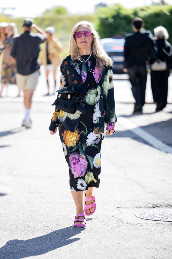COPENHAGEN, DENMARK - AUGUST 06: A guest wears skirt, top with graphic print, black bag outside Joao Maraschin during day two of the Copenhagen Fashion Week (CPHFW) SS25 on August 06, 2024 in Copenhagen, Denmark. (Photo by Christian Vierig/Getty Images)