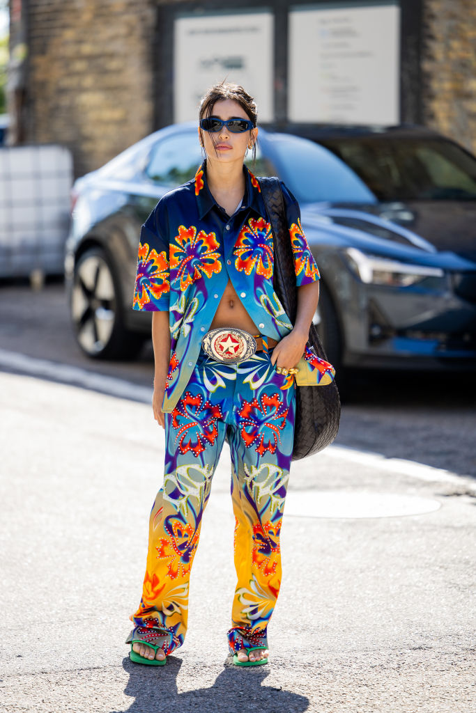 COPENHAGEN, DENMARK - AUGUST 06: Livia Nunes Marques wears button shirt, pants with graphic print, belt, black oversized Bottega Veneta bag outside Joao Maraschin during day two of the Copenhagen Fashion Week (CPHFW) SS25 on August 06, 2024 in Copenhagen, Denmark. (Photo by Christian Vierig/Getty Images)