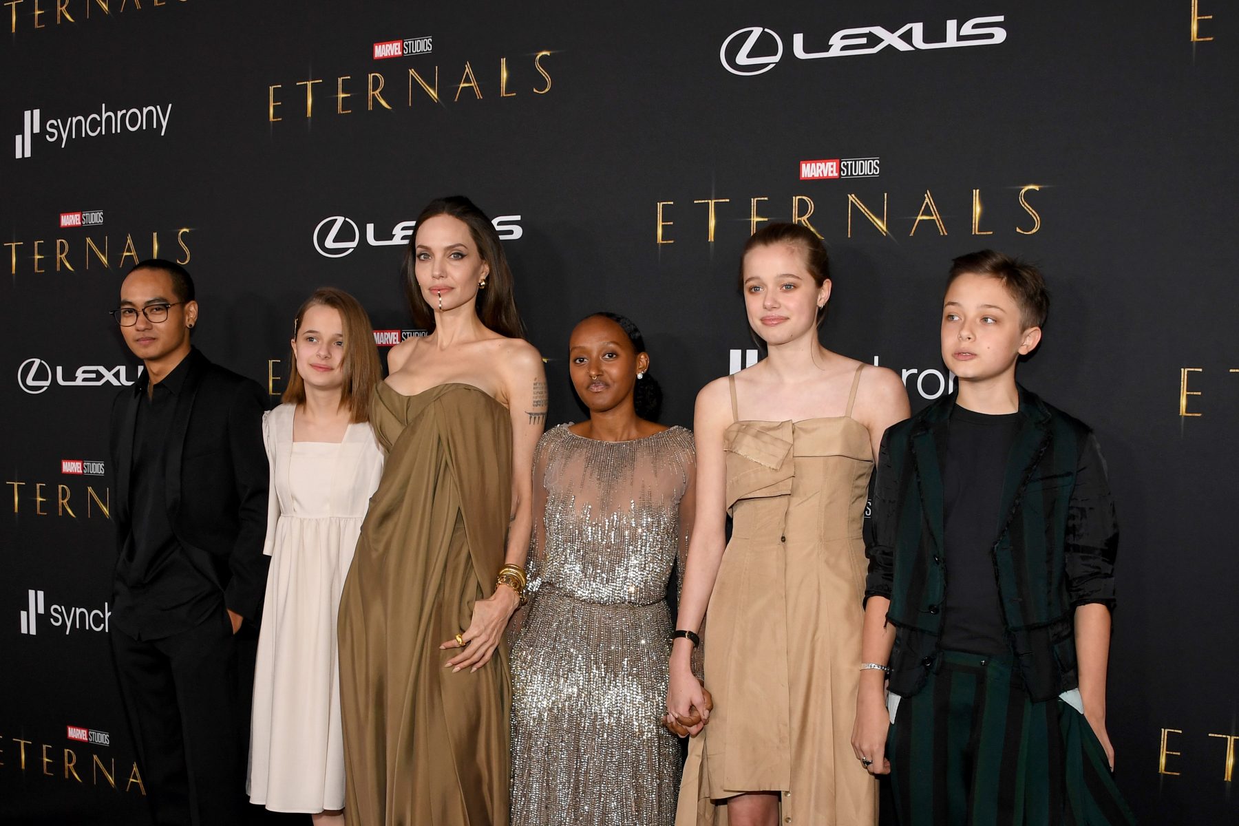 LOS ANGELES, CALIFORNIA - OCTOBER 18: (L-R) Maddox Jolie-Pitt, Vivienne Jolie-Pitt, Angelina Jolie, Zahara Jolie-Pitt, Shiloh Jolie-Pitt, and Knox Jolie-Pitt arrive for the World Premiere of Marvel Studios’ Eternals at the El Capitan Theatre in Hollywood on October 18, 2021. (Photo by Jon Kopaloff/Getty Images for Lexus)