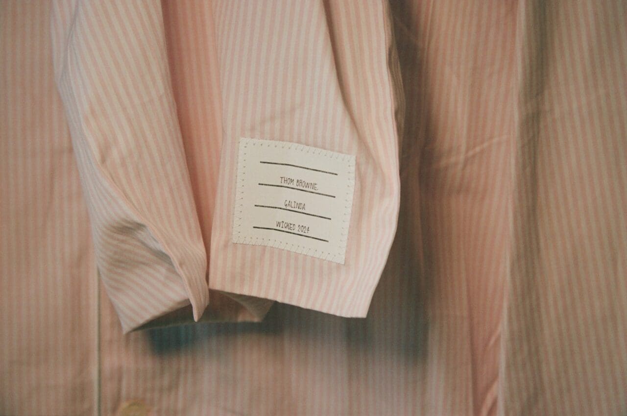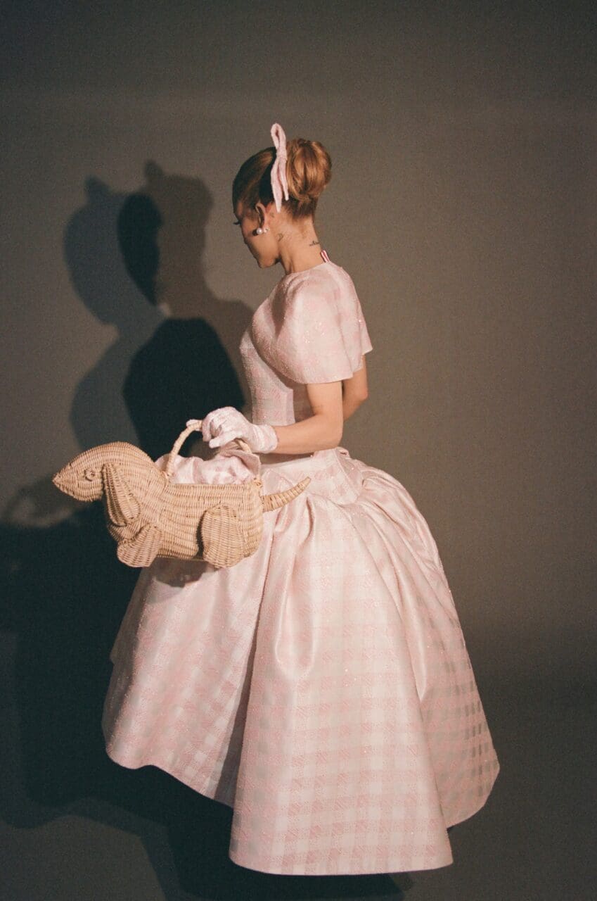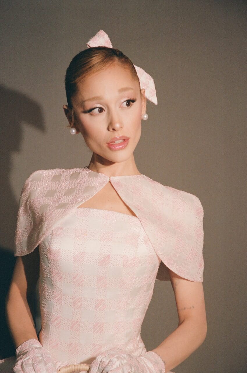 Ariana 昨晚在首映禮上展現她最佳的紅地毯造型——理所當然地選用了代表 Glinda 的粉紅色。這位明星穿着由 Thom Browne 定製的淺粉紅色和白色格子禮服,外搭優雅的披肩斗篷。Ariana 表示:「一如既往地,能夠和 Thom Browne 合作宛如夢想成真。」她在 2024 年奧運會開幕式上也穿着了這位設計師的作品。「我最喜歡這件裙子的部分大概是高低不對稱的裙擺,這對我來說非常有 Ozian 的感覺。(還有)格子布上的精緻珠飾。」雖然這一造型靈感來自 Glinda,但配飾則完全是 Dorothy 的風格,因為她手上拿著一個狗形手提包——就像是 Hector 與 Toto 的結合;還有閃亮的 Swarvoski 水晶高跟鞋。Ariana 說:「我們不僅想致敬 Glinda,同時也想致敬 Dorothy,尤其是來自 L. Frank Baum 原版書中的珠寶鞋——事實上,它們並非紅色!」無論顏色如何,這雙鞋子確實非常奇妙:「這件作品採用了 60 萬顆三切面珠子,5 萬片粉色水晶,還有 50 位來自 Thom Browne 團隊、才華洋溢的藝術家參與創作。」