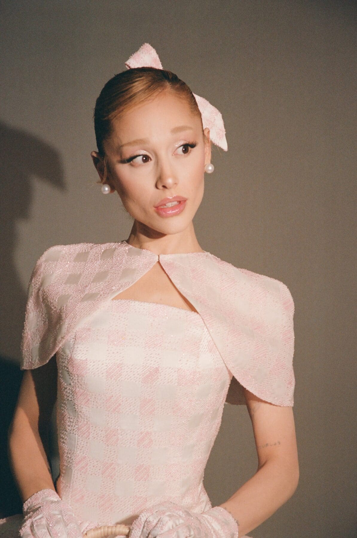 Ariana 昨晚在首映禮上展現她最佳的紅地毯造型——理所當然地選用了代表 Glinda 的粉紅色。這位明星穿着由 Thom Browne 定製的淺粉紅色和白色格子禮服,外搭優雅的披肩斗篷。Ariana 表示:「一如既往地,能夠和 Thom Browne 合作宛如夢想成真。」她在 2024 年奧運會開幕式上也穿着了這位設計師的作品。「我最喜歡這件裙子的部分大概是高低不對稱的裙擺,這對我來說非常有 Ozian 的感覺。(還有)格子布上的精緻珠飾。」雖然這一造型靈感來自 Glinda,但配飾則完全是 Dorothy 的風格,因為她手上拿著一個狗形手提包——就像是 Hector 與 Toto 的結合;還有閃亮的 Swarvoski 水晶高跟鞋。Ariana 說:「我們不僅想致敬 Glinda,同時也想致敬 Dorothy,尤其是來自 L. Frank Baum 原版書中的珠寶鞋——事實上,它們並非紅色!」無論顏色如何,這雙鞋子確實非常奇妙:「這件作品採用了 60 萬顆三切面珠子,5 萬片粉色水晶,還有 50 位來自 Thom Browne 團隊、才華洋溢的藝術家參與創作。」