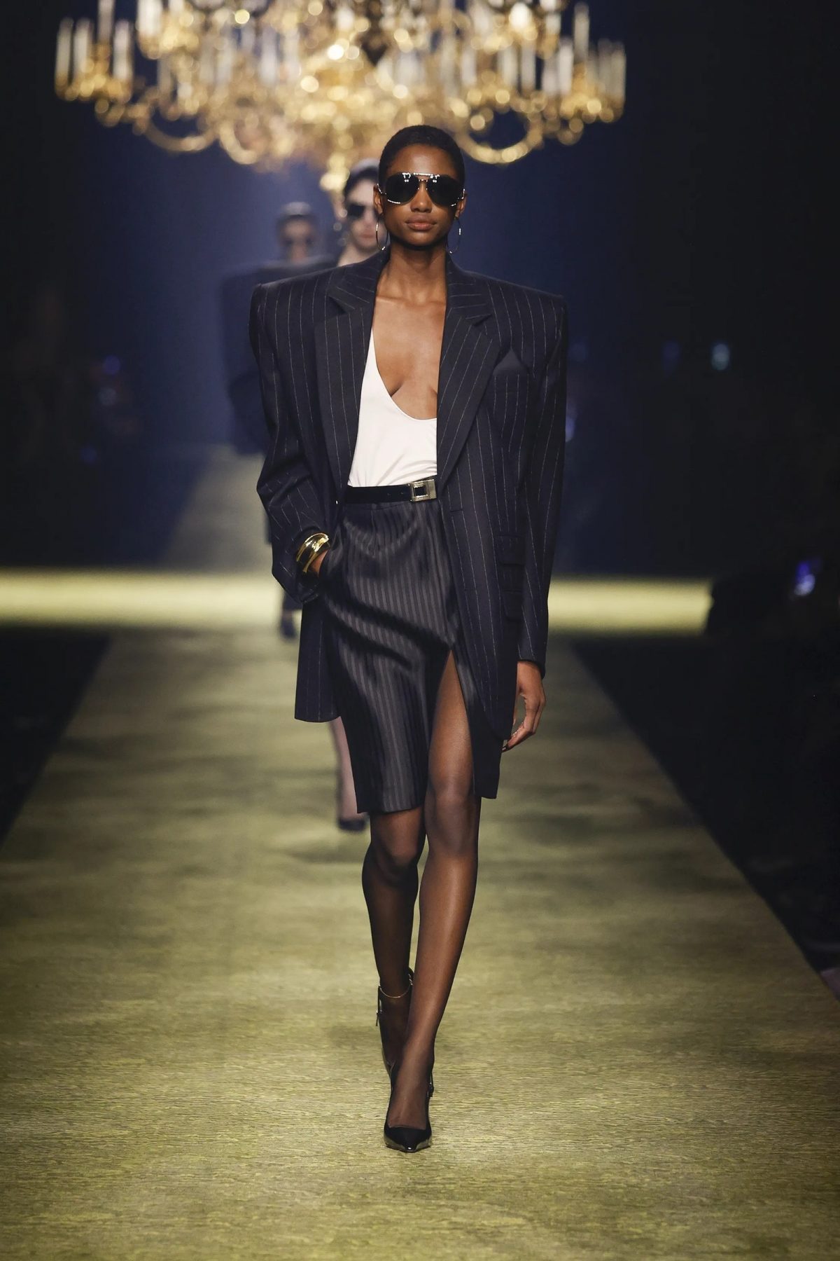 Saint Laurent 的秋冬系列代表了今季西裝外套的風格。正如《Vogue》的 Mark Holgate在他的評論中指出的那樣:「[Anthony] Vaccarello 的造型依賴於一件超大而誇張的肩部西裝外套,將它變成經典的男士西裝外套剪裁,或吸煙裝,或天鵝絨西裝外套」。這位設計師的風格鮮明的西裝外套採用男裝面料製成(正如Saint Laurent在他那個時代所做的那樣),其特點是棱角分明、誇張的肩部、鋒利的翻領和修長的下擺,剛剛好掠過模特兒的大腿。完美展示了「Power Blazer」的定義。