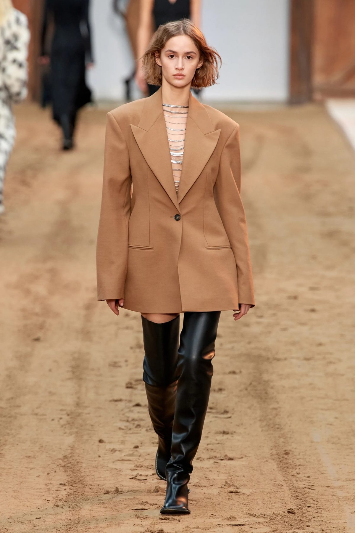 在 Alexander McQueen,Sarah Burton 則探索了「剪裁的解剖學」,她追溯到McQueen 在 Savile Row 的根源。Burton 的西裝外套肩部比Vaccarello’的西裝外套更加流線型,但同樣具有影響力。同樣的還見於 Bottega Veneta 的雕塑沙漏款式和 Stella McCartney 的單排扣款西裝外套,它搭配長筒靴作為連衣裙穿著。