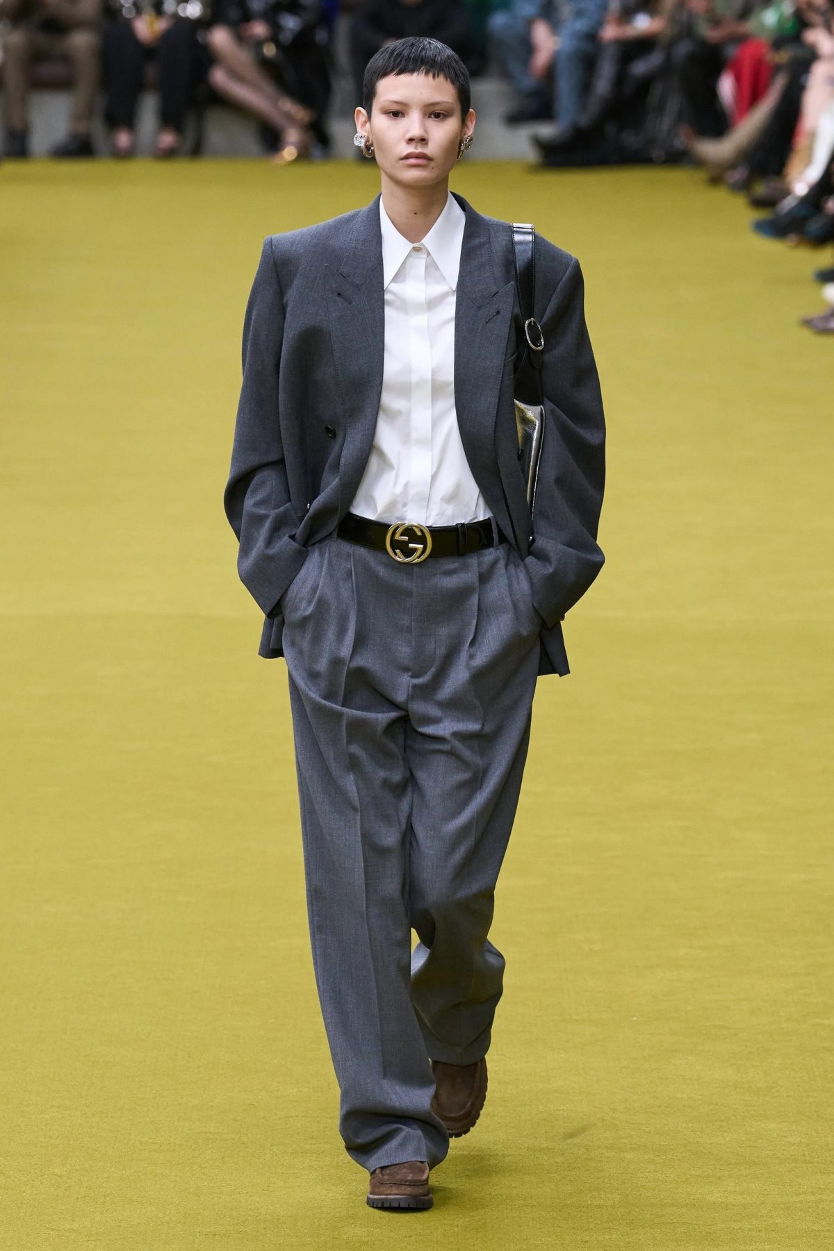 在色彩繽紛的人造毛皮和裸色連衣裙中,Gucci 的設計團隊(在Sabato De Sarno 於2024 年春夏首次亮相之前,在沒有創意總監的情況下工作)提出了多種剪裁選擇:從鴿灰色皮革套裝到燕尾服外套,以至由四四方方的西裝外套搭配寬鬆的牛仔褲,為新一季提供了豐富的造型靈感。