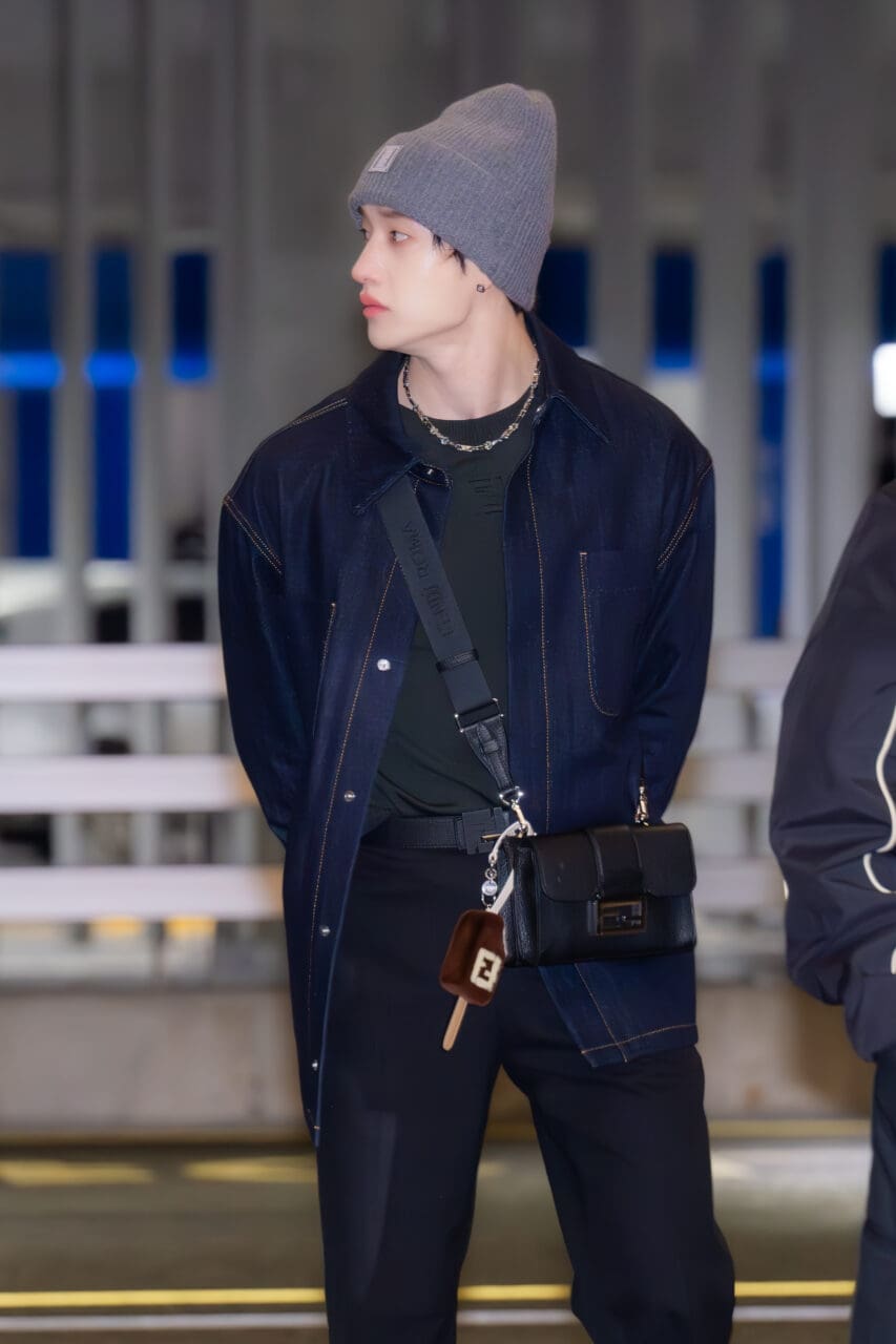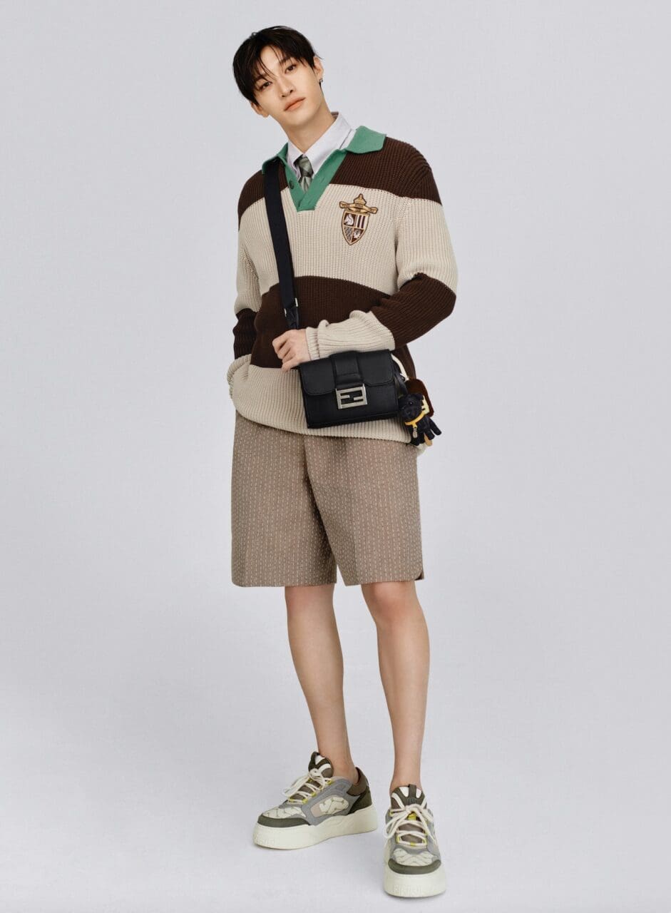 這次的官方宣傳照中,Bang Chan以2025年春夏男裝系列的完整造型亮相,啡白條紋棉質針織上衣,綠色翻領細節更顯個性,搭配白色恤衫、綠色領帶,以及提花短褲和Selleria工藝製成的Fendi Force運動鞋。配飾方面,他選擇了黑色Cuoio Romano皮革Baguette Double以及Peekaboo Soft Small,兩者均繫上Ito小狗及雪糕造型的趣怪吊飾,將整體造型昇華。來自FF及Fendi Hexagon兩個流行配飾系列的精品,包括戒指、耳環和手鐲,更顯Bang Chan的時尚品味。就在今天,他以Fendi造型出發<dominATE>世界巡演香港站,讓我們一同期待他未來將如何詮釋品牌新品!