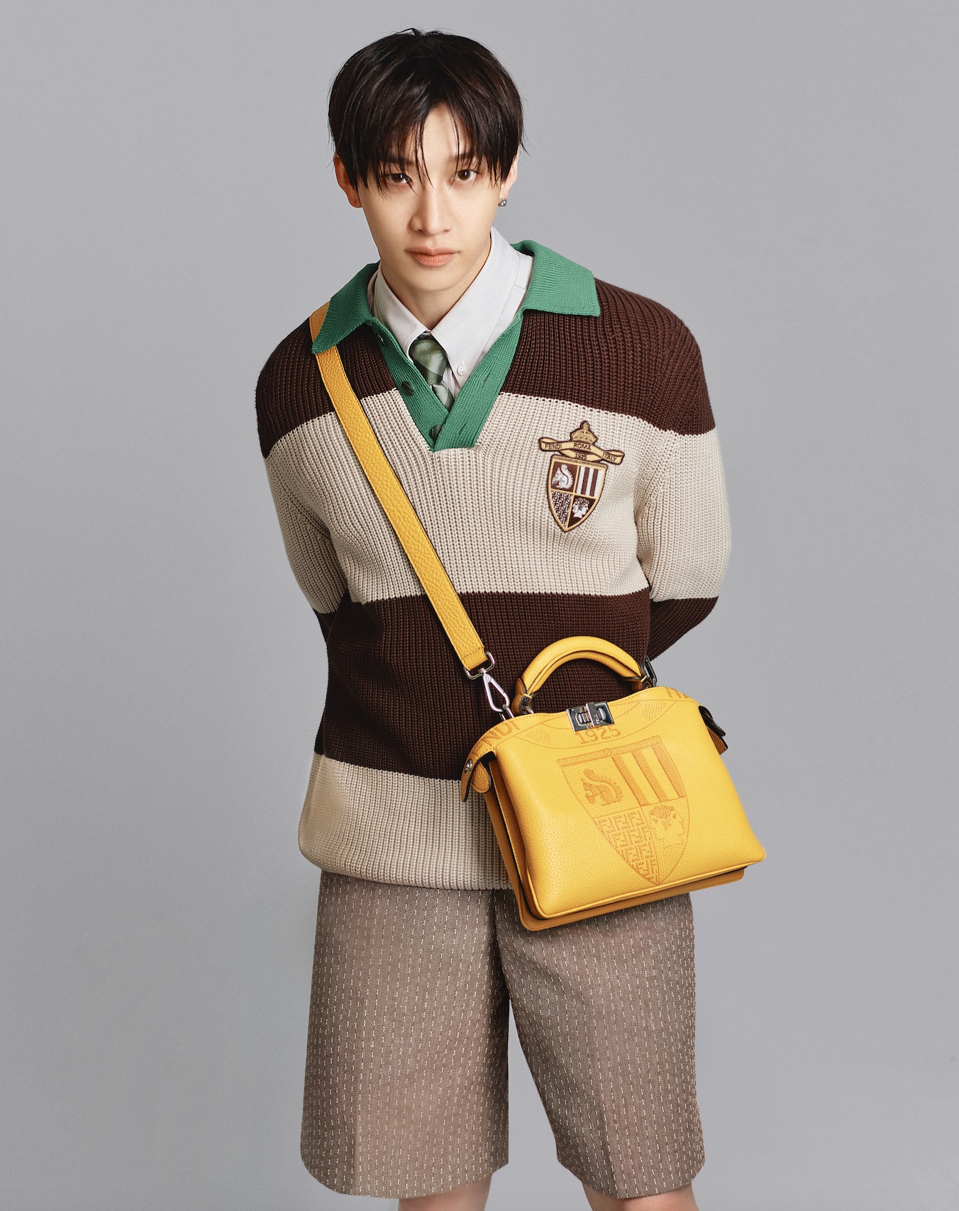 這次的官方宣傳照中,Bang Chan以2025年春夏男裝系列的完整造型亮相,啡白條紋棉質針織上衣,綠色翻領細節更顯個性,搭配白色恤衫、綠色領帶,以及提花短褲和Selleria工藝製成的Fendi Force運動鞋。配飾方面,他選擇了黑色Cuoio Romano皮革Baguette Double以及Peekaboo Soft Small,兩者均繫上Ito小狗及雪糕造型的趣怪吊飾,將整體造型昇華。來自FF及Fendi Hexagon兩個流行配飾系列的精品,包括戒指、耳環和手鐲,更顯Bang Chan的時尚品味。就在今天,他以Fendi造型出發<dominATE>世界巡演香港站,讓我們一同期待他未來將如何詮釋品牌新品!