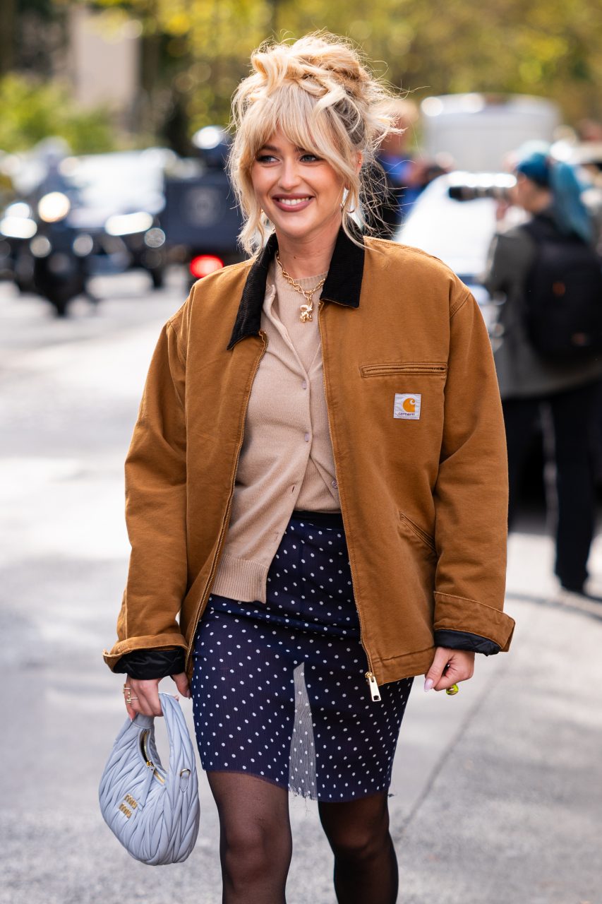 PARIS, FRANCE - OCTOBER 03: Emili Sindlev wears a beige top and cardigan, blue polka dot mini skirt, brown Carhartt jacket, grey Miu Miu bag, outside Miu Miu, during the Womenswear Spring/Summer 2024 as part of Paris Fashion Week on October 03, 2023 in Paris, France. (Photo by Claudio Lavenia/Getty Images)