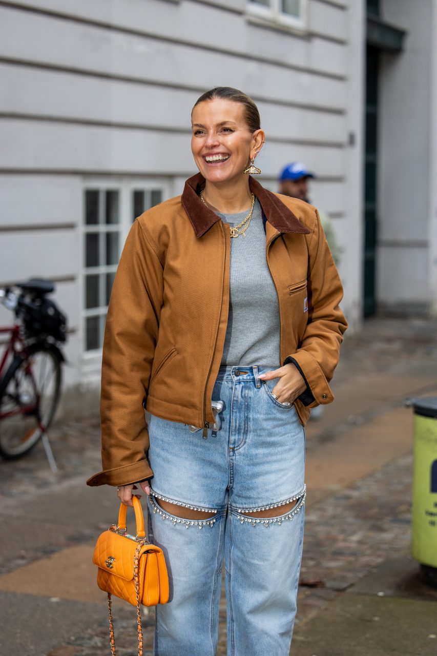 COPENHAGEN, DENMARK - JANUARY 30: Janka Polliani wears brown jacket, ripped denim jeans, orange Chanel bag, grey shirt outside Lovechild 1979 during the Copenhagen Fashion Week AW24 on January 30, 2024 in Copenhagen, Denmark. (Photo by Christian Vierig/Getty Images)
