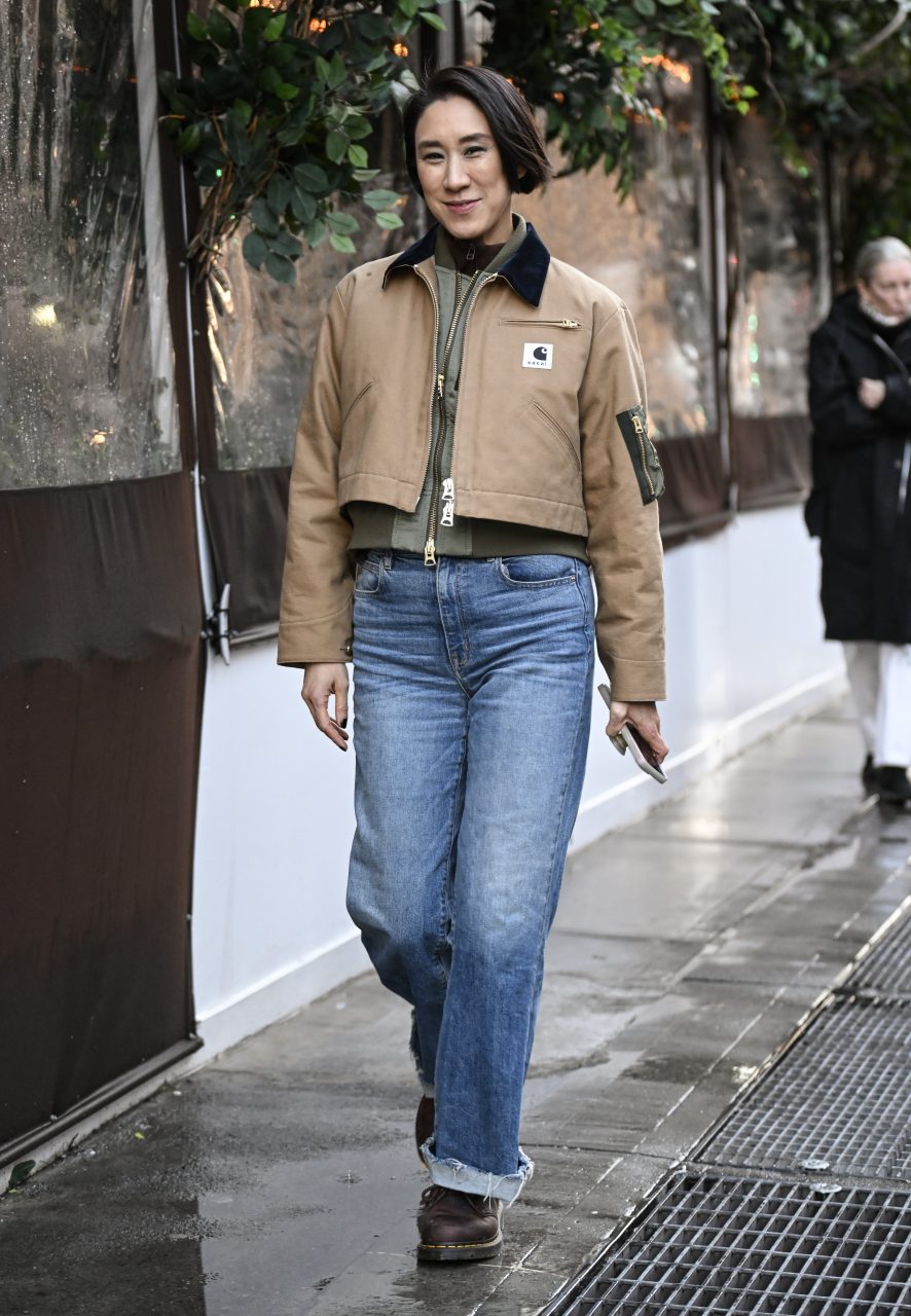 NEW YORK, NEW YORK - FEBRUARY 13: Eva Chen is seen wearing a Sacai x Carhartt jacket, blue jeans and brown shoes outside the Michael Kors show during NYFW F/W 2024 on February 13, 2024 in New York City. (Photo by Daniel Zuchnik/Getty Images)
