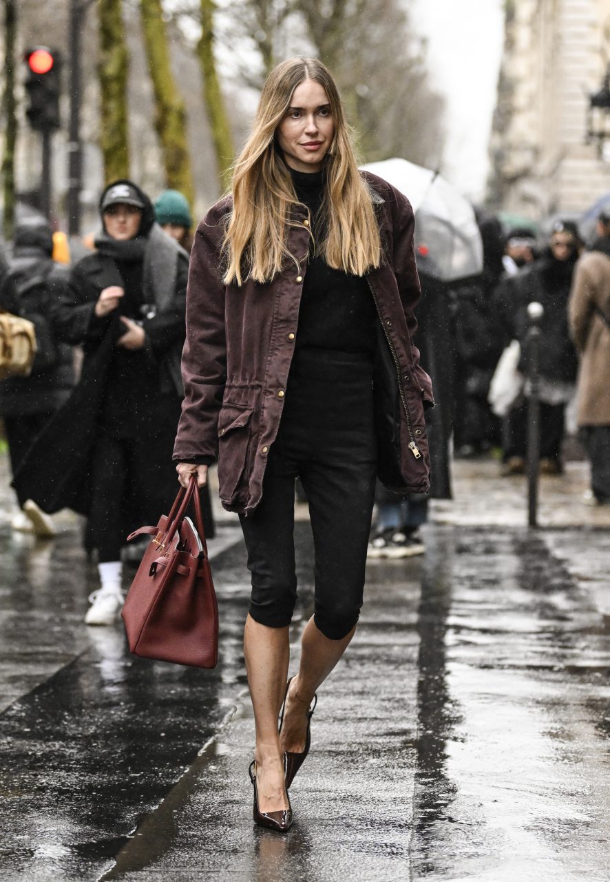 PARIS, FRANCE - MARCH 02: Pernille Teisbaek is seen wearing a maroon jacket, black top, black shorts, black heels and maroon Hermes bag outside the Hermes show during the Womenswear Fall/Winter 2024/2025 as part of Paris Fashion Week on March 02, 2024 in Paris, France. (Photo by Daniel Zuchnik/Getty Images)