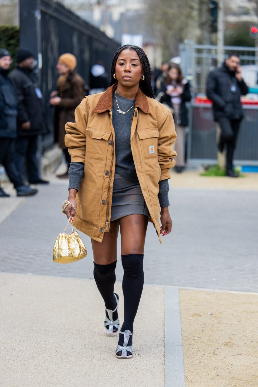 PARIS, FRANCE - MARCH 05: A guest wears beige oversized Carhartt jacket, grey jumper, skirt, golden bag, over knee high socks outside Lacoste during the Womenswear Fall/Winter 2024/2025 as part of Paris Fashion Week on March 05, 2024 in Paris, France. (Photo by Christian Vierig/Getty Images)
