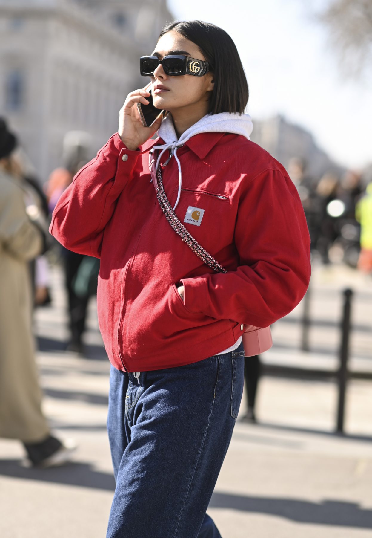 PARIS, FRANCE - MARCH 08: A model is seen wearing a red Carhartt jacket, blue jeans and Gucci sunglasses outside the Chanel show during Paris Fashion Week A/W 2022 on March 08, 2022 in Paris, France. (Photo by Daniel Zuchnik/Getty Images)