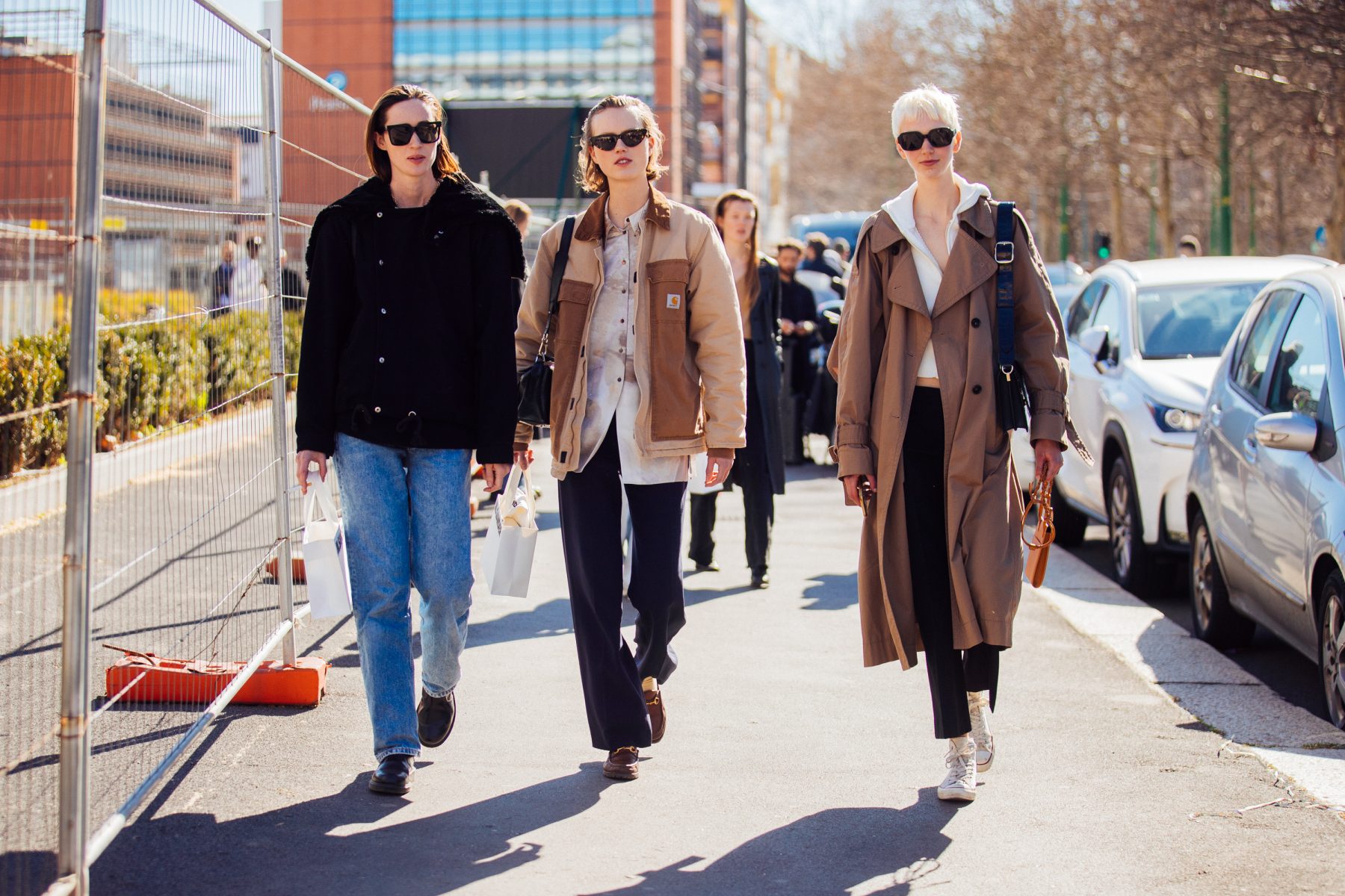 MILAN, ITALY - FEBRUARY 26: Models Helena Severin, Julie Hoomans, and Bente Oort after the Jil Sander show during the Milan Fashion Week Fall/Winter 2022/2023 on February 26, 2022 in Milan, Italy. Julie wears a brown Carhartt jacket. (Photo by Melodie Jeng/Getty Images)