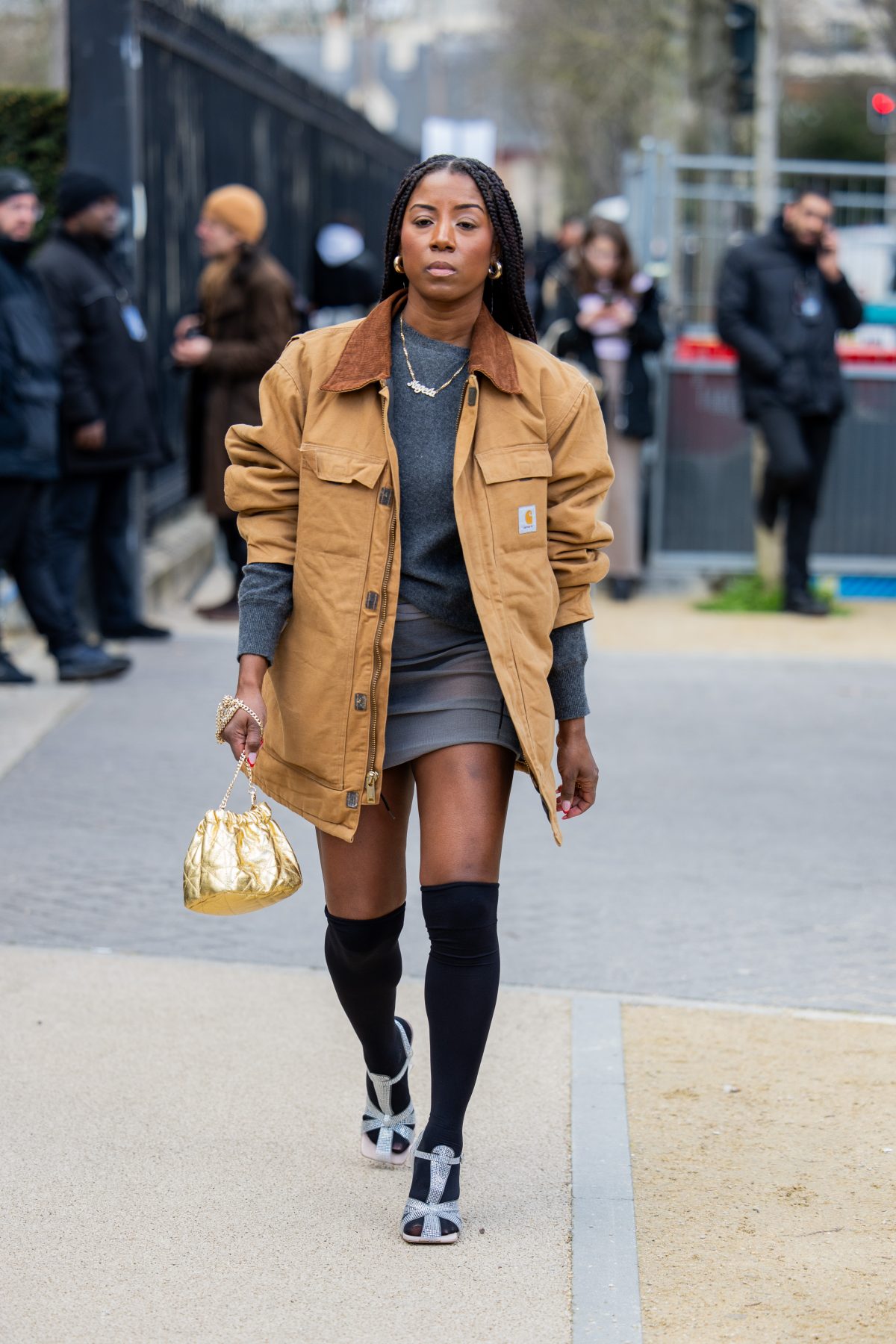 PARIS, FRANCE - MARCH 05: A guest wears beige oversized Carhartt jacket, grey jumper, skirt, golden bag, over knee high socks outside Lacoste during the Womenswear Fall/Winter 2024/2025 as part of Paris Fashion Week on March 05, 2024 in Paris, France. (Photo by Christian Vierig/Getty Images)