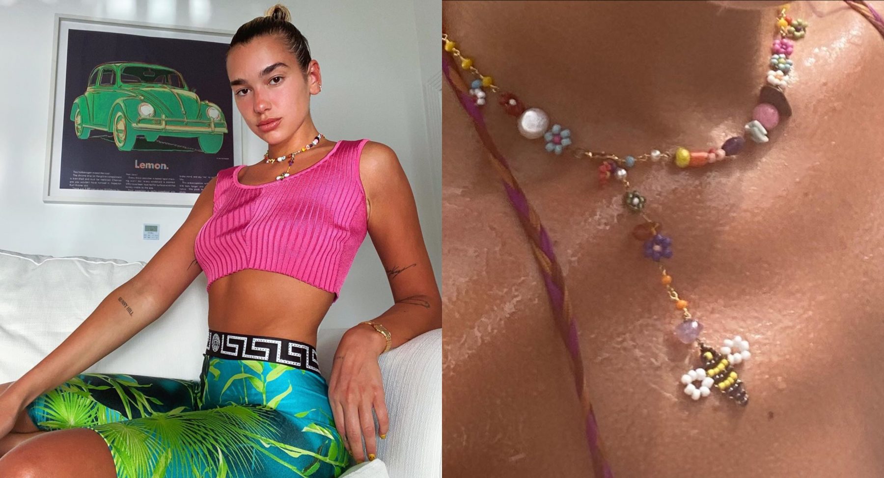 Dua Lipa 最近與男友 Anwar Hadid 去到加勒比 St. Lucia 島上度過一個「Island Isolated」假期,大曬恩愛之餘,她的七彩串珠項鍊亦十分耀眼,甚至為這條項鍊拍下一個特寫。最新一張照片上,可以看到穿上 Versace 服裝的 Dup Lipa 戴上這條由 Giulia Rossetti 製作的項鍊,有花朵亦有蜜蜂串珠造型,七彩繽紛充滿夏日活力,可愛且具原創性。