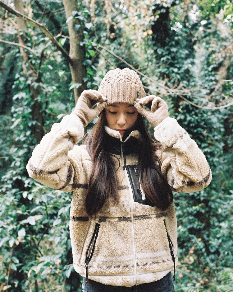 f(x) Krystal 戴上印有品牌 Ralph Lauren logo 的冷帽。
